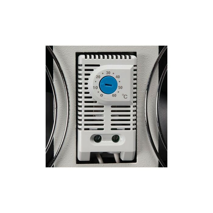 - Изделие состоит из основания (листовая сталь 1 мм), корпуса (листовая сталь 1 мм), вентиляторов, закрытых с обеих сторон решетками. Оснащено термореле с регулировкой температуры включения от 0 до 60°С, порог выключения – понижение температуры на 7°С (± 4°С) от заданной.