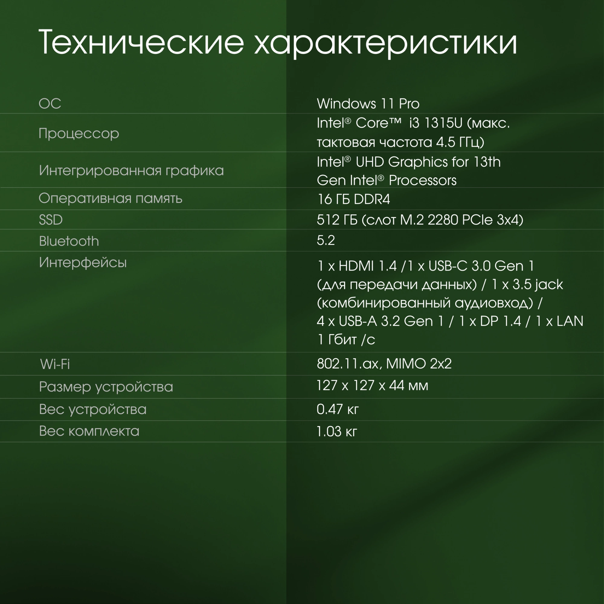 Неттоп Digma Pro Minimax U1 i3 1315U (1.2) 16Gb SSD512Gb UHDG Windows 11 Professional GbitEth WiFi BT 60W темно-серый/черный [DPP3-ADXW02]