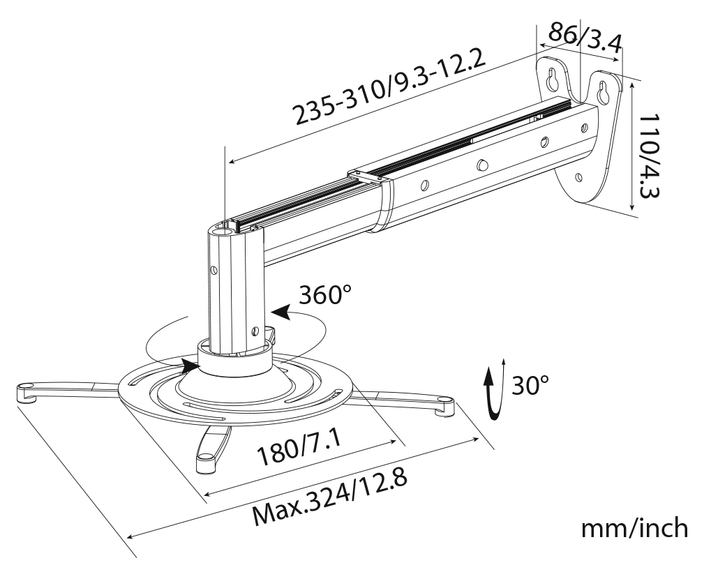 | Особенности | Инструменты в комплекте; Возможность быстрого снятия; Установочные отверстия: 8-30.7 см. Выдвижная штанга сделана из алюминия, остальные части корнштейна из стали. |