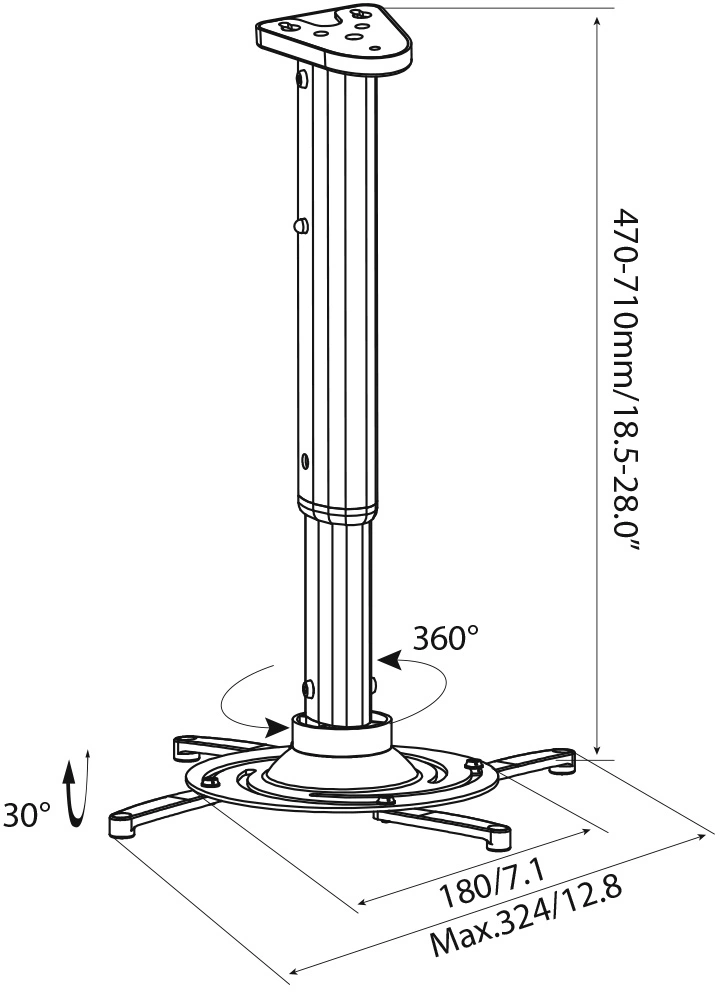 | Особенности | Инструменты в комплекте; Возможность быстрого снятия; Установочные отверстия: 8-30.7 см. Выдвижная штанга сделана из алюминия, остальные части корнштейна из стали. |