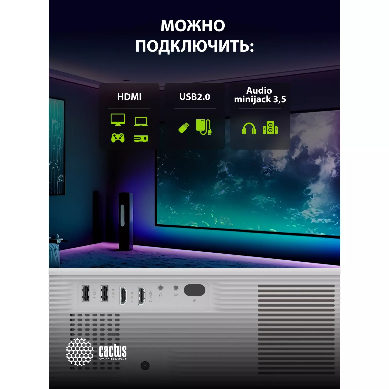 Проектор Cactus CS-PRM.01WT Full HD LCD 700Lm ANSI (1920x1080) 2500:1 ресурс лампы: 50000 часов 2xUSB typeA 2xHDMI 1.8кг [CS-PRM.01WT.WUXGA]