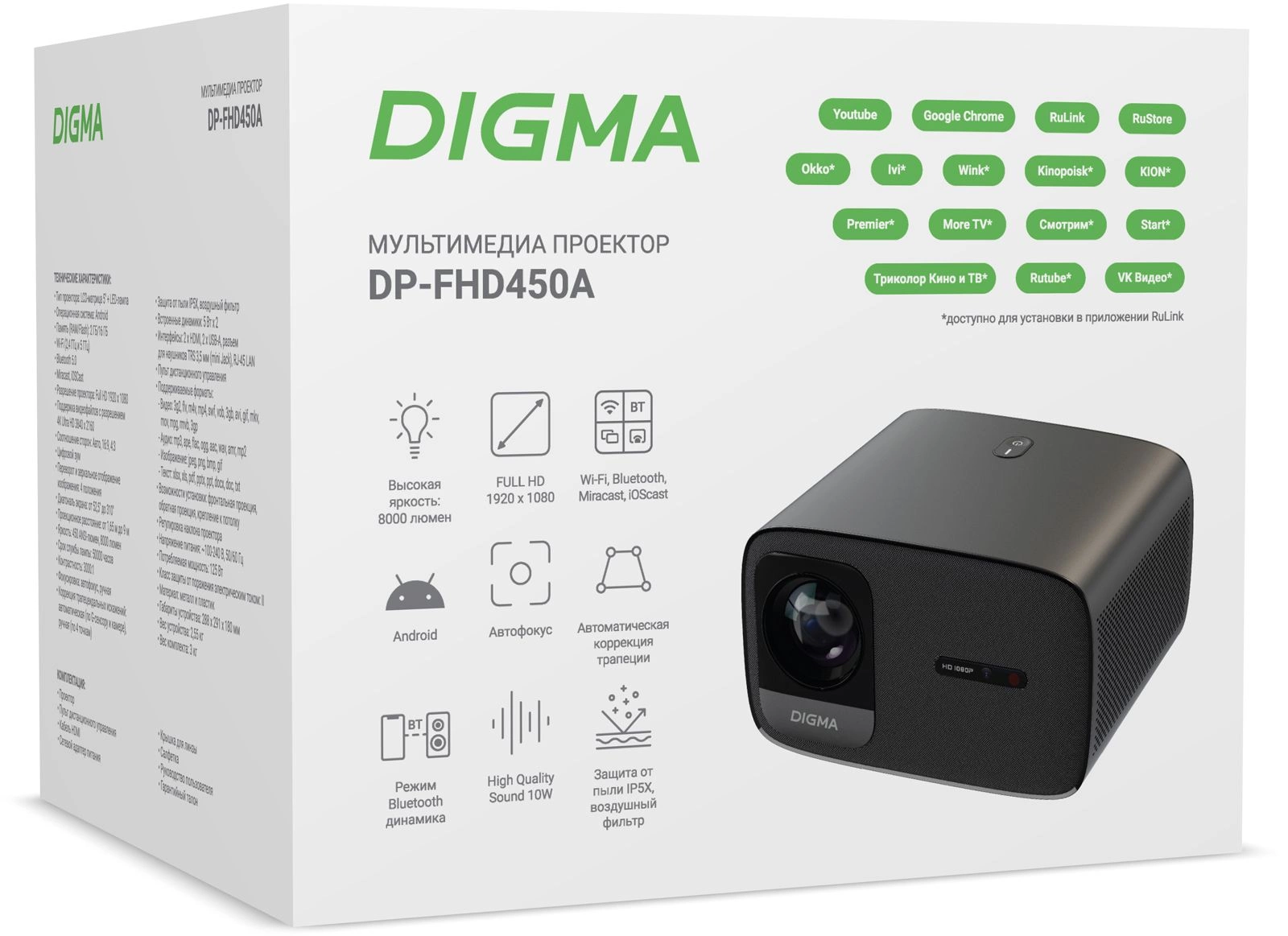 | Комплектация | Проектор Digma DP-FHD450A, пульт ДУ, Крышка объектива, Кабель HDMI, Сетевой адаптер питания, Салфетка, Руководство пользователя, Гарантийный талон |