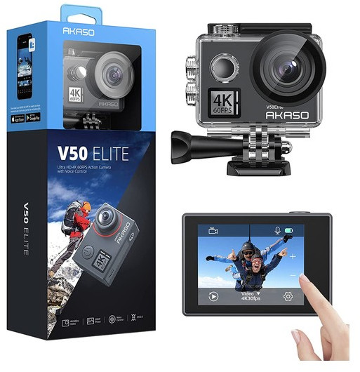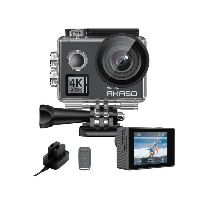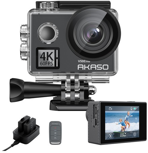 - AKASO V50 Elite Action Camera, 1x Пульт управления, 2x 1050 мАч аккумулятора, 1x Влагозащитный чехол, 1x ЗУ для аккумуляторов, 1x Крепление для велосипеда, 6x различных креплений, 2x 2-х сторонняя клейкая лента, 2x Крепления для шлема, 1x Ремешок, 5x Стяжки, 1x Защитная задняя крышка, 1x USB-C кабель, 1x Тряпочка для протирки линзы, 1x Quick Reference Guide