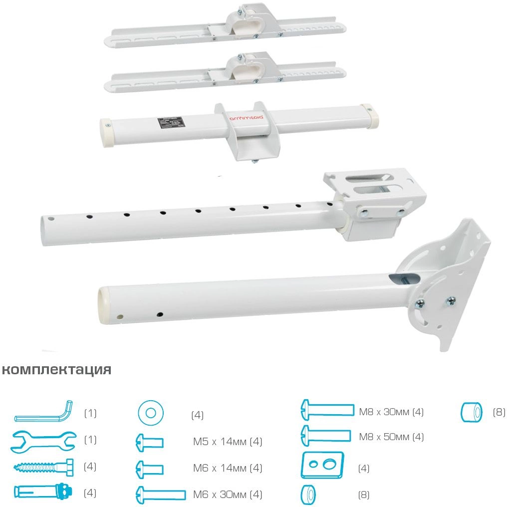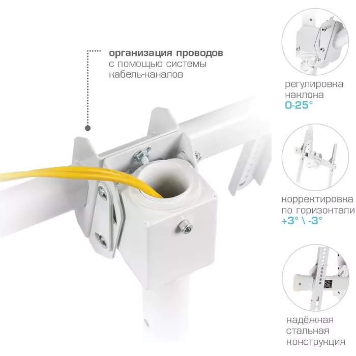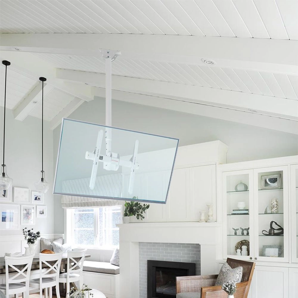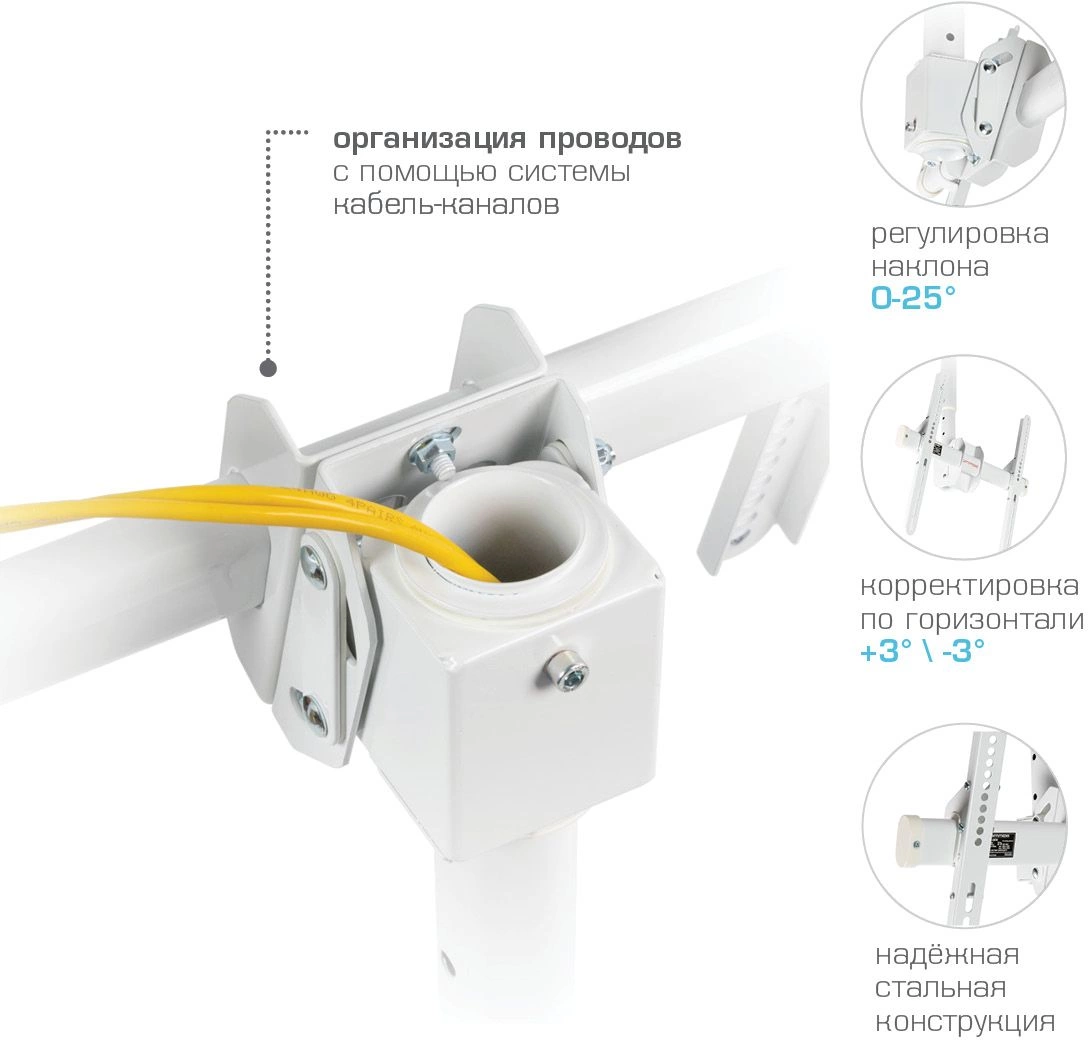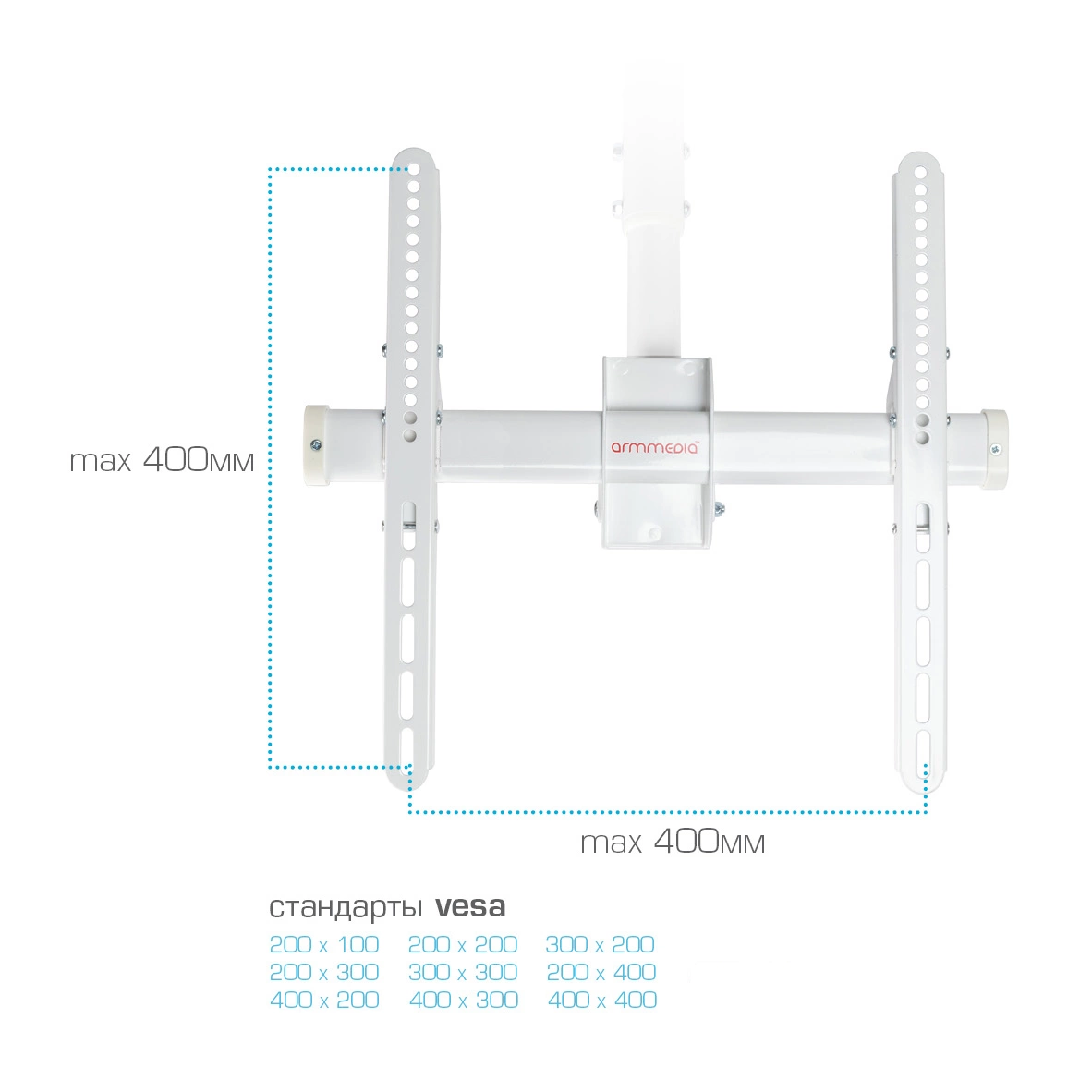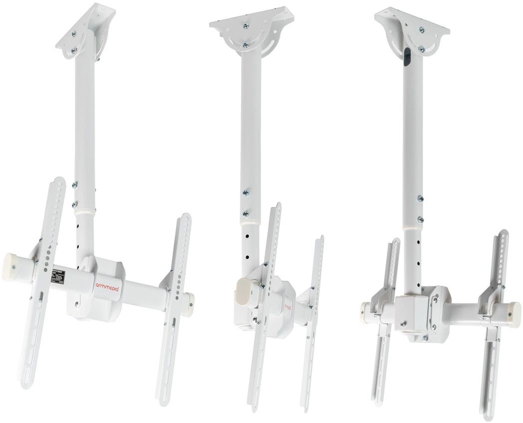 Потолочный кронштейн для LCD/LED телевизоров размером от 26 до 65 дюймов с максимальным весом до 50 кг. с возможностью крепления на наклонный потолок. Надежная стальная конструкция. Регулировка наклона 0-25 и углом поворота ±180 градусов. Максимальные крепежные размеры 400х400 мм.