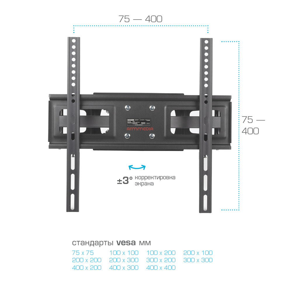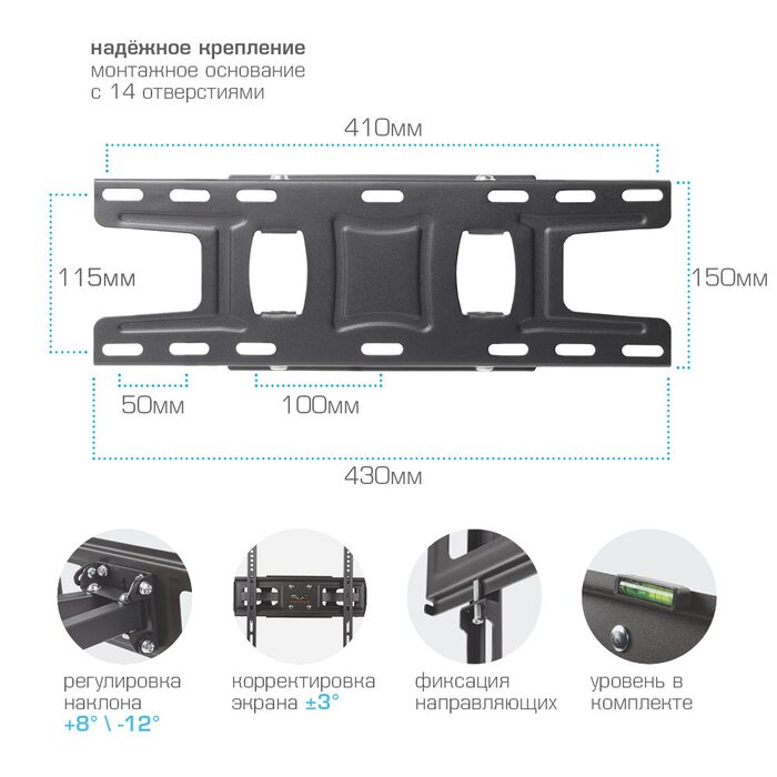 Универсальный - телевизор на кронштейне можно наклонить, повернуть и сдвинуть к стене. Легкий монтаж телевизора - благодаря наличию съемной монтажной пластины. Широкое настенное основание. Корректировка экрана ±3°. Водяной уровень.