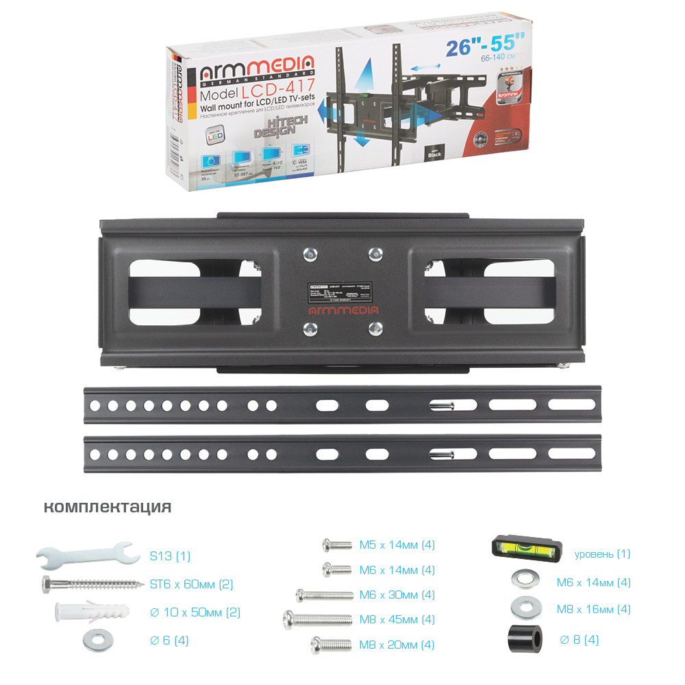 | Подходит для телевизоров c диагональю | 26", 28", 32", 37", 39", 40", 42", 43", 46", 48", 50", 52", 55" |