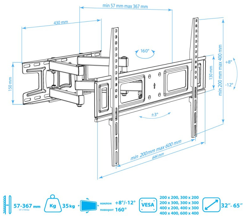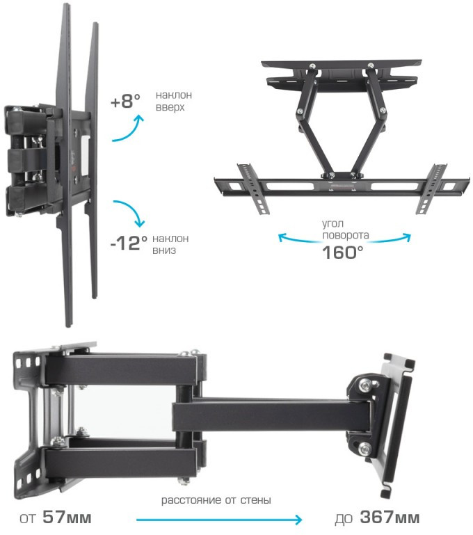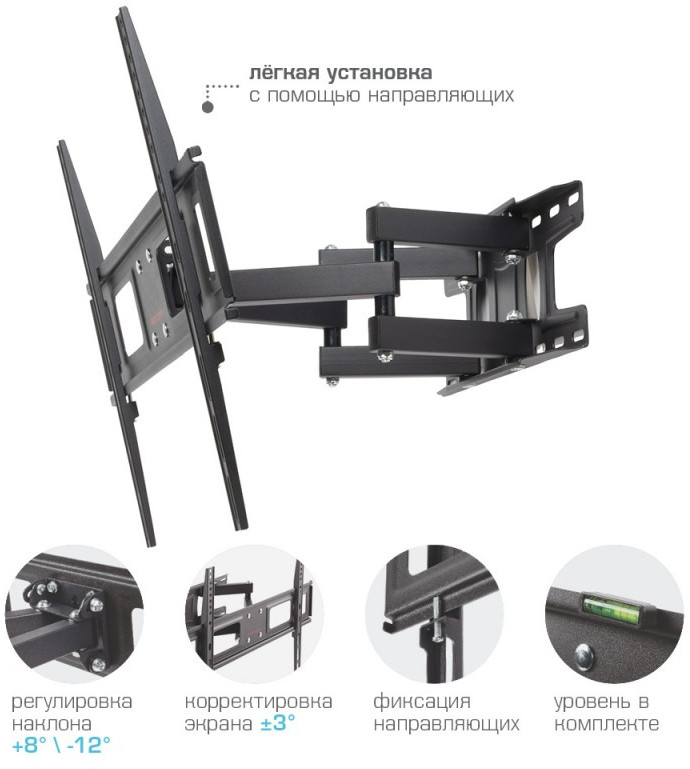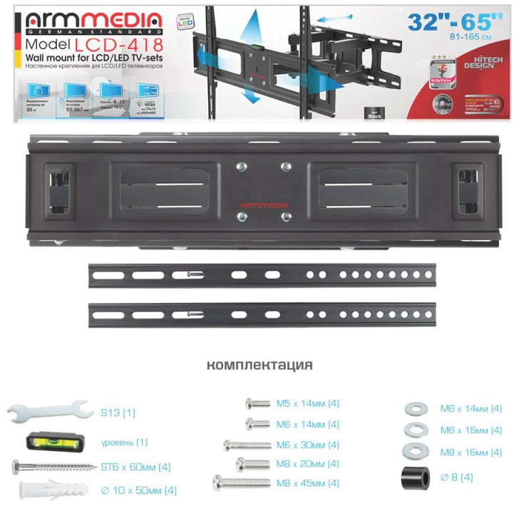 - ARM MEDIA LCD-418 BLACK надёжно удержит экран размером 32"-65" дюйма и весом 35 кг. Простая конструкция ARM MEDIA LCD-418 BLACK идеально подойдет для самостоятельного монтажа. Наклонно-поворотная регулировка позволит наклонять вверх и вниз на +8 -12°, поворачивать влево и вправо на 160°, и выдвигать на 57-367 мм