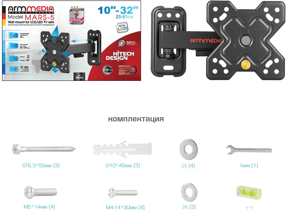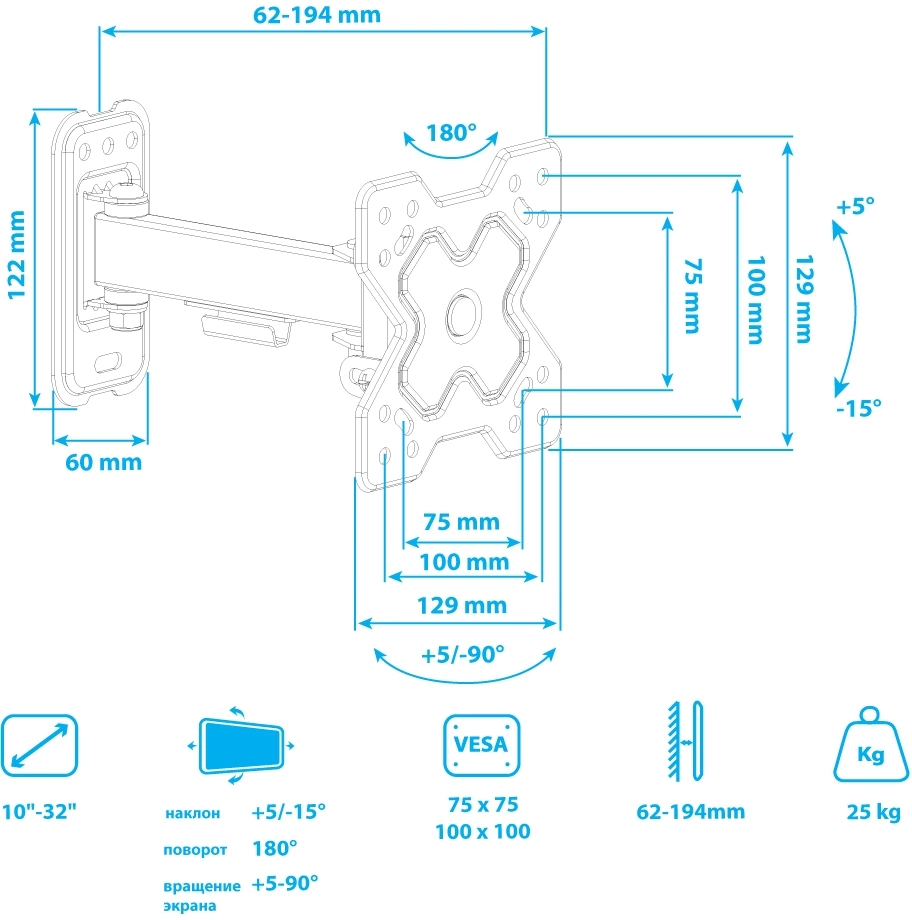 | Подходит для телевизоров c диагональю | 10", 13", 15", 19", 22", 23", 24", 26", 28", 32" |