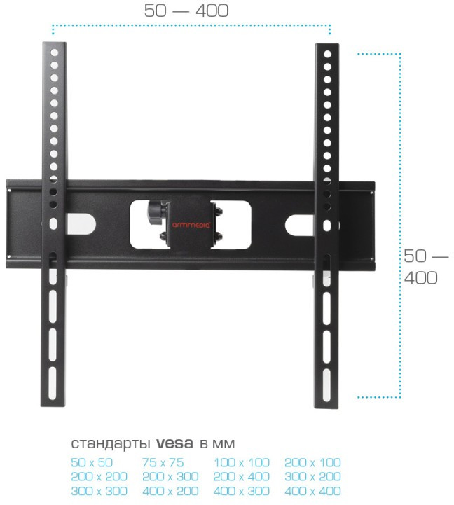 - Крепежные отверстия (VESA) 50 x 50, 75 x 75, 100 x 100, 200 x 100, 200 x 200, 300 x 200, 200 x 300, 300 x 300, 200 x 400, 400 x 200, 400 x 300, 400 x 400