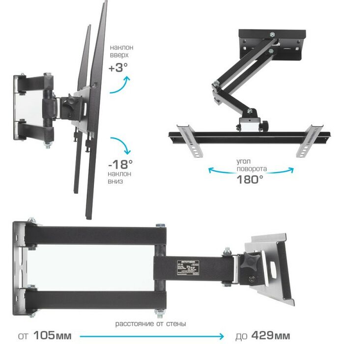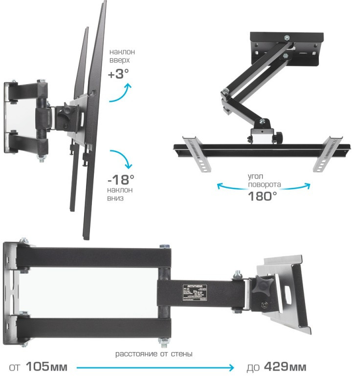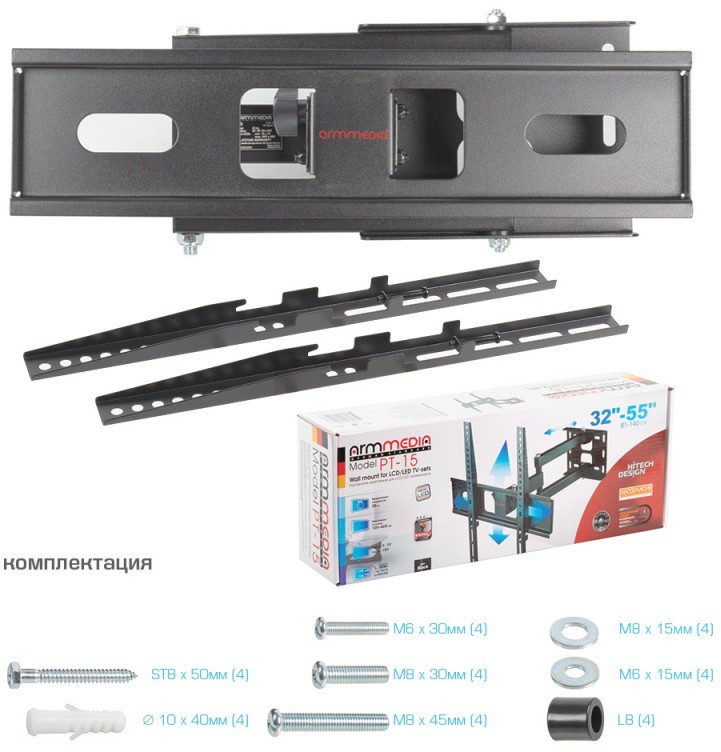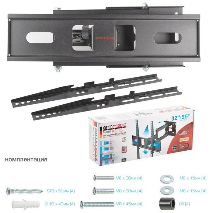 - ARM MEDIA PT-15 BLACK надёжно удержит экран размером 32"-55 дюйма и весом 35 кг. Простая конструкция ARM MEDIA PT-15 BLACK идеально подойдет для самостоятельного монтажа. Наклонно-поворотная регулировка позволит наклонять вверх и вниз на +5 -18°, поворачивать влево и вправо на 180°, и выдвигать на 105-429 мм
