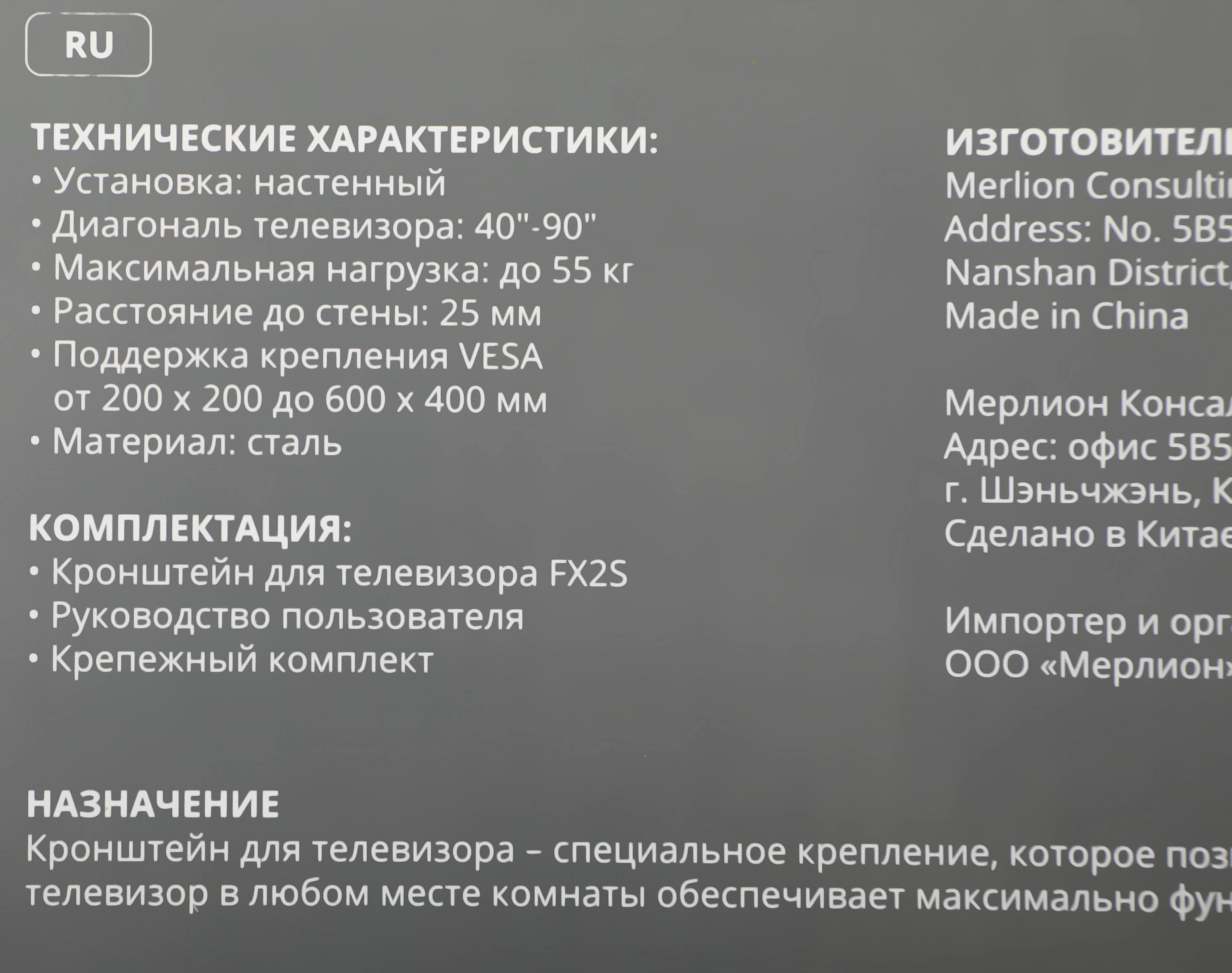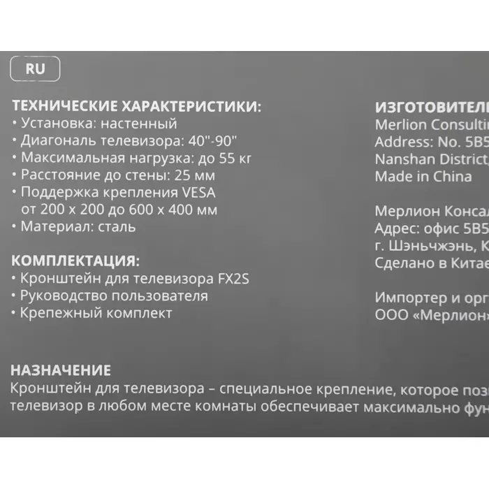 | Подходит для телевизоров c диагональю | 40", 42", 46", 48", 50", 52", 55", 60", 65", 70", 75", 85" |