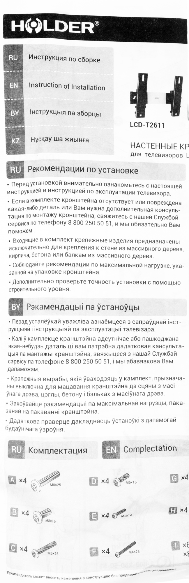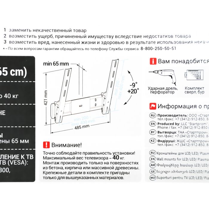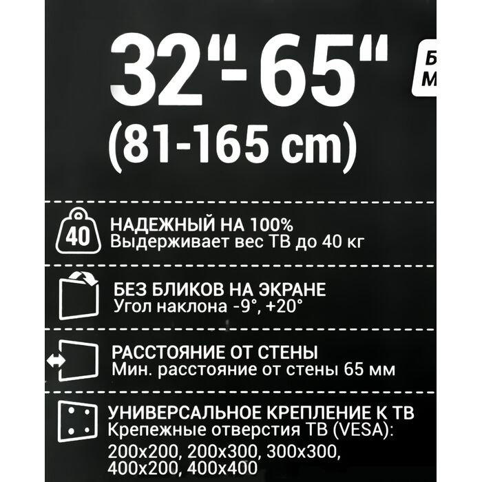 | Подходит для телевизоров c диагональю | 32", 37", 39", 40", 42", 46", 48", 50", 52", 55", 60", 65" |