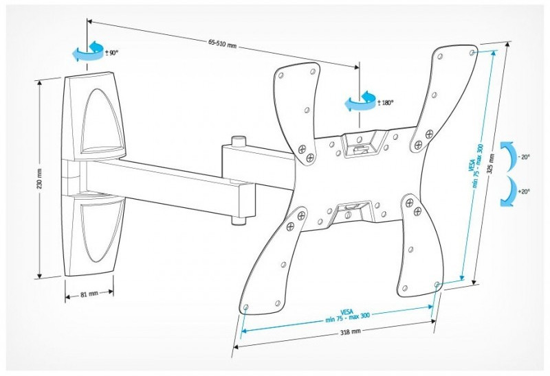 - Простая регулировка: угол наклона и поворота ТВ меняется движением одной руки