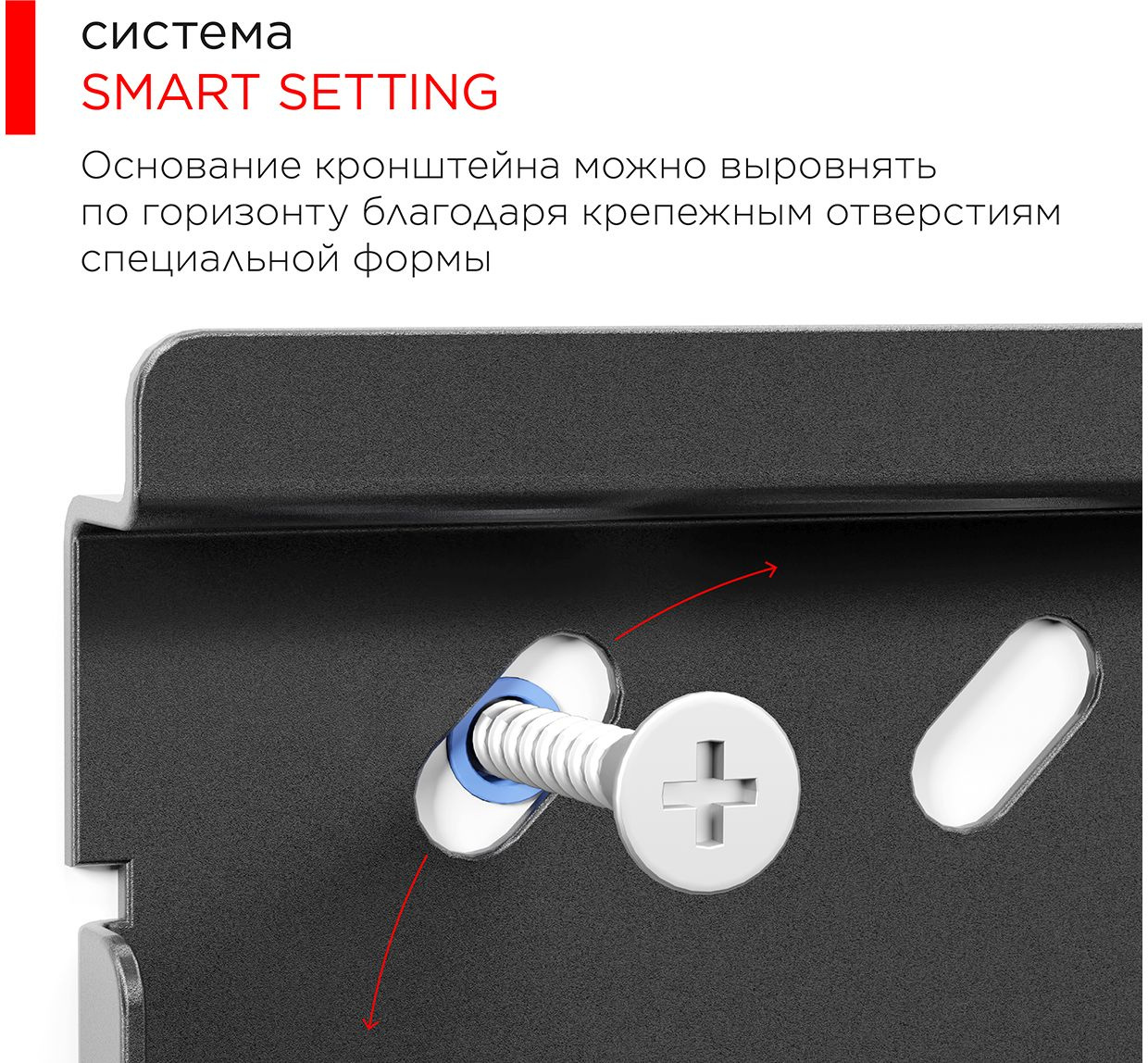 | Особенности | фиксирующий механизм надежно удерживает телевизор. основание кронштейна можно выровнять по горизонту благодаря крепежным отверстиям специальной формы. угол наклона регулируется без использования инструментов. |