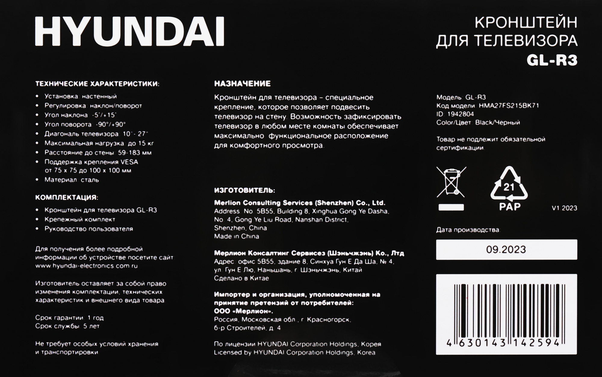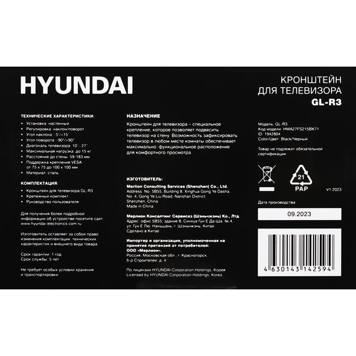 Наличие товара Hyundai GL-R3 [HMA27FS215BK71]