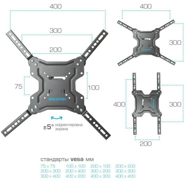 - Крепежные отверстия (VESA) 75 x 75, 100 x 100, 200 x 100, 200 x 200, 300 x 200, 200 x 300, 300 x 300, 200 x 400, 400 x 200, 400 x 300, 400 x 400