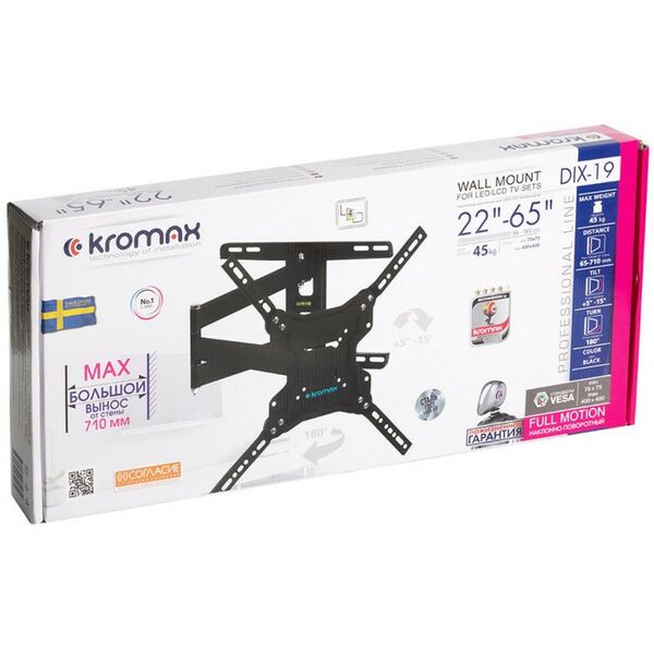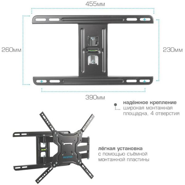 - Универсальный - телевизор на кронштейне можно наклонить, повернуть и сдвинуть к стене