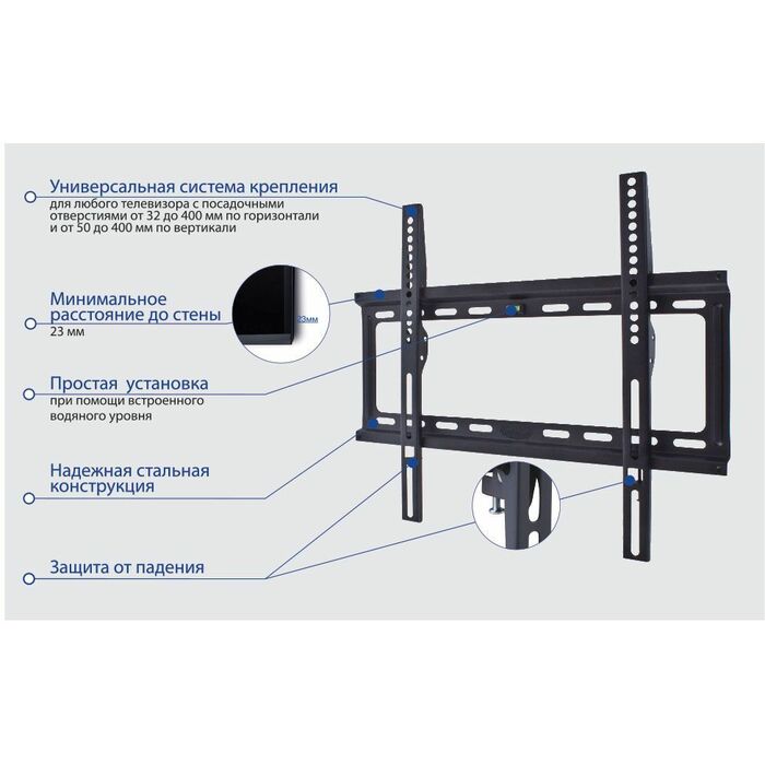 | Подходит для телевизоров c диагональю | 22", 24", 26", 28", 32", 37", 39", 40", 42", 46", 48", 50", 52", 55", 60", 65" |