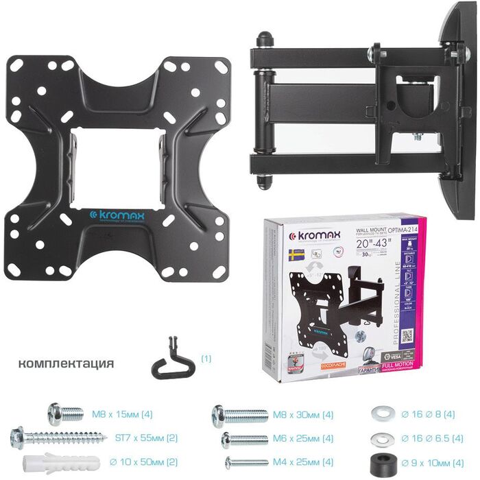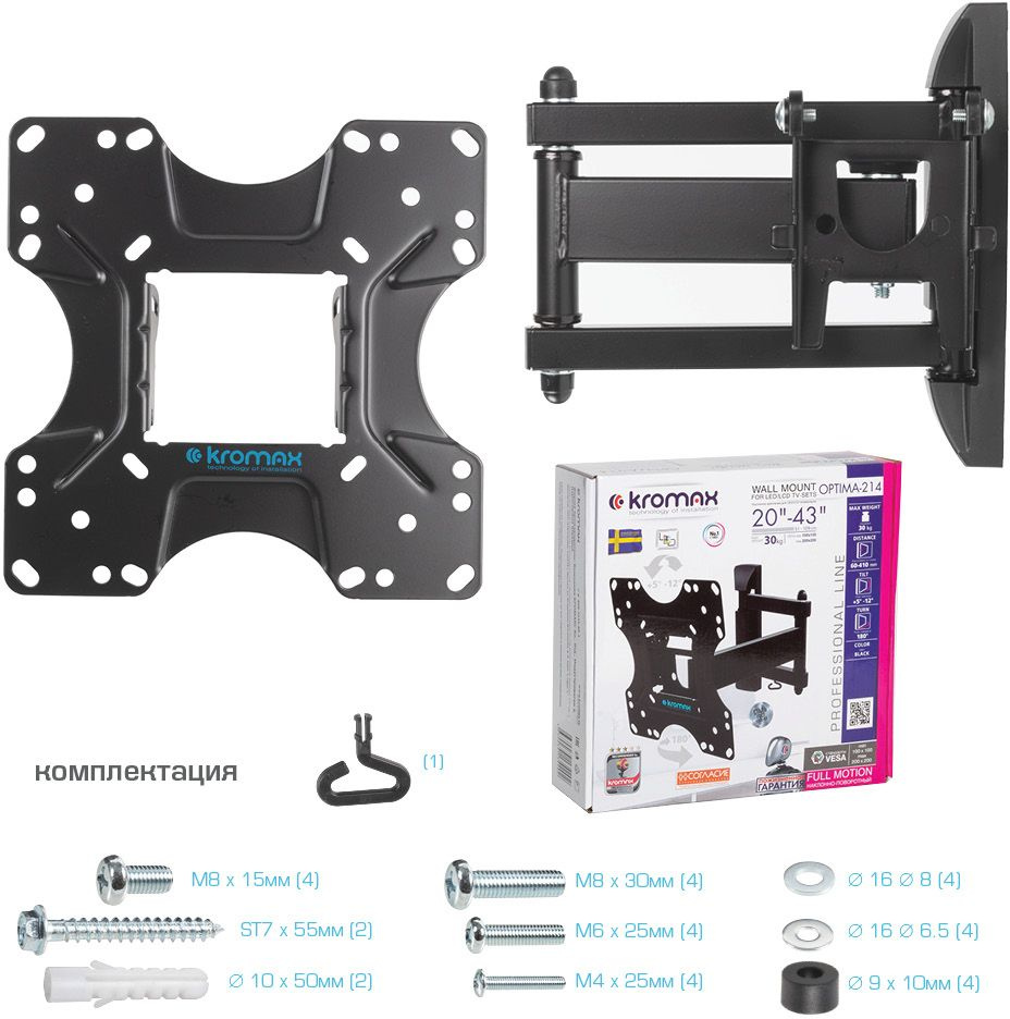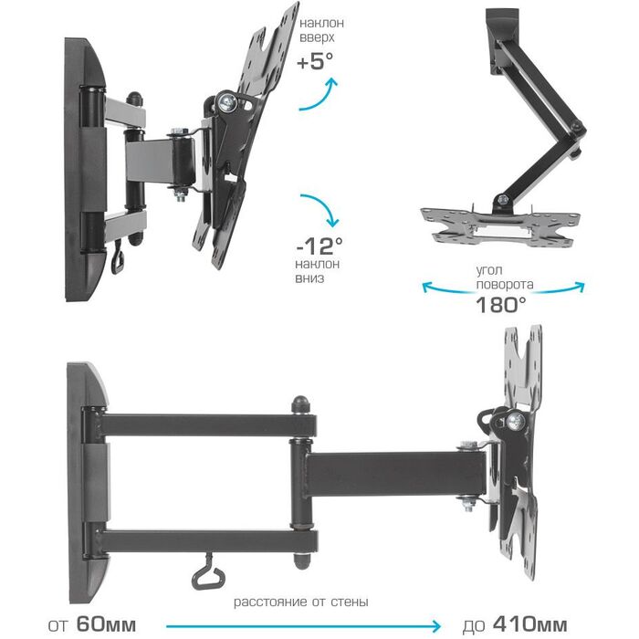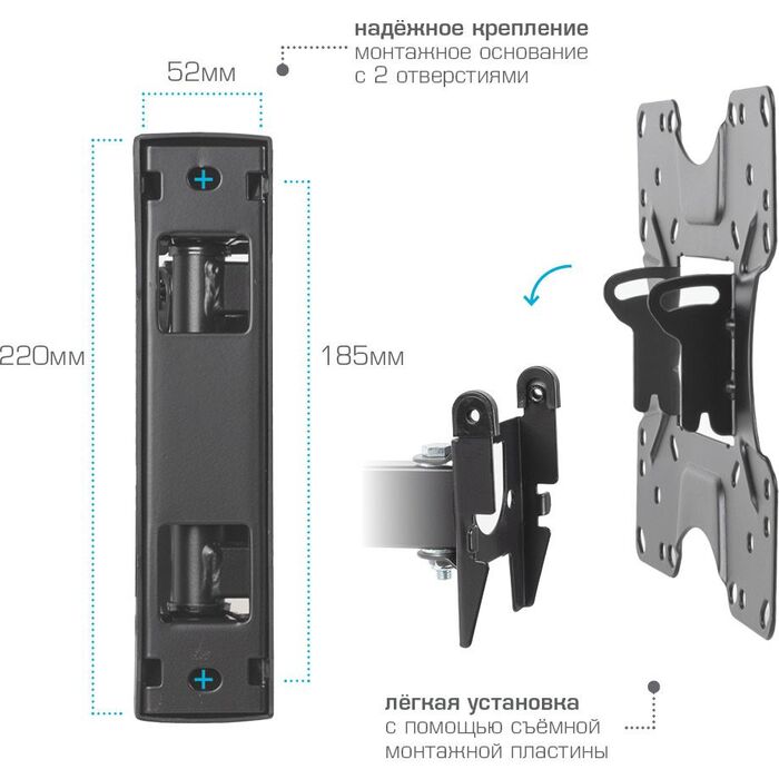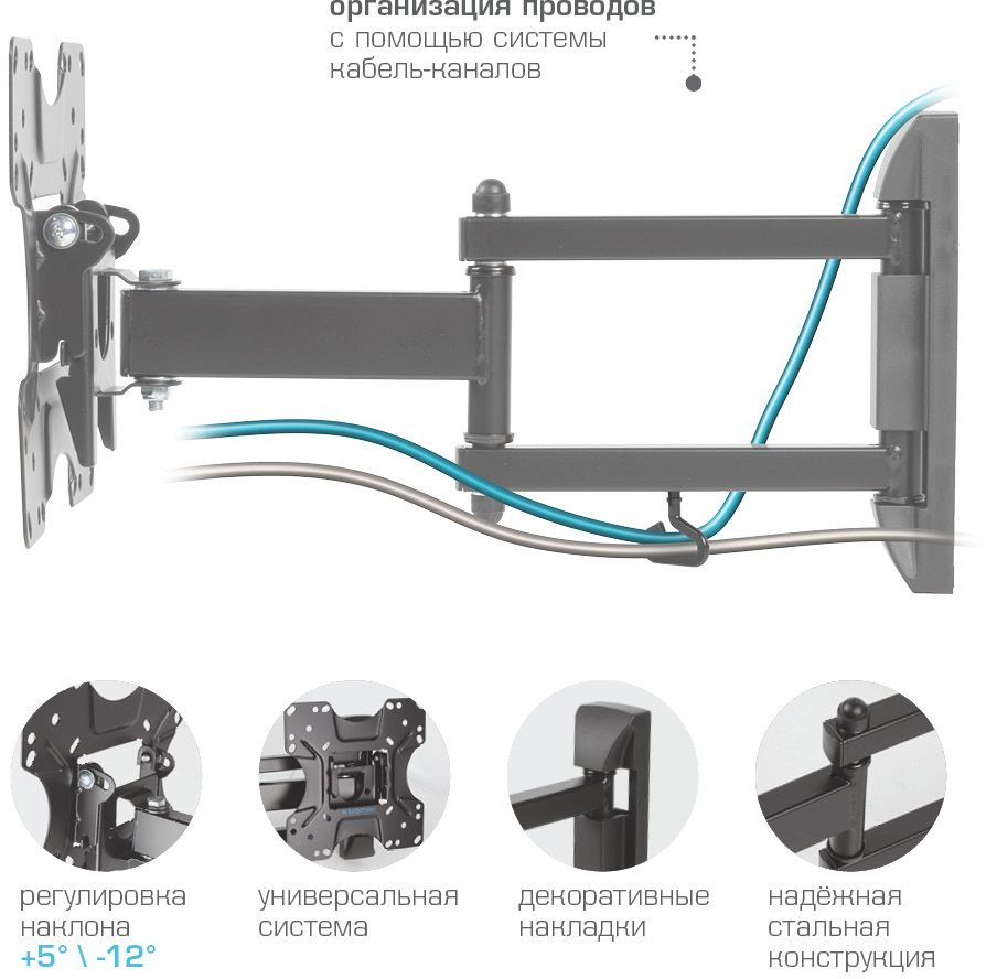 Легкий монтаж при помощи съемной монтажной пластины. Надежная стальная конструкция. Универсальный телевизор на кронштейне можно наклонить, повернуть и сдвинуть к стене. Декоративные накладки. Кабель-канал.