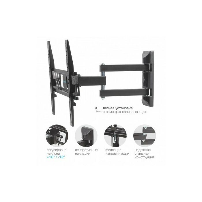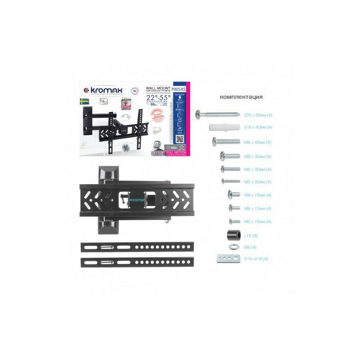 - KROMAX PIXIS-XS BLACK надёжно удержит экран размером 22"-55" дюйма и весом 30 кг. Простая конструкция KROMAX PIXIS-XS BLACK идеально подойдет для самостоятельного монтажа. Наклонно-поворотная регулировка позволит наклонять вверх и вниз на ±12°, поворачивать влево и вправо на 180°, и выдвигать на 95-423 мм