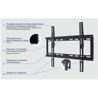 Характеристики Подходит для телевизоров c диагональю 32", 37", 39", 40", 42", 46", 48", 50", 52", 55", 60", 65", 70", 75" Поддержка крепления...