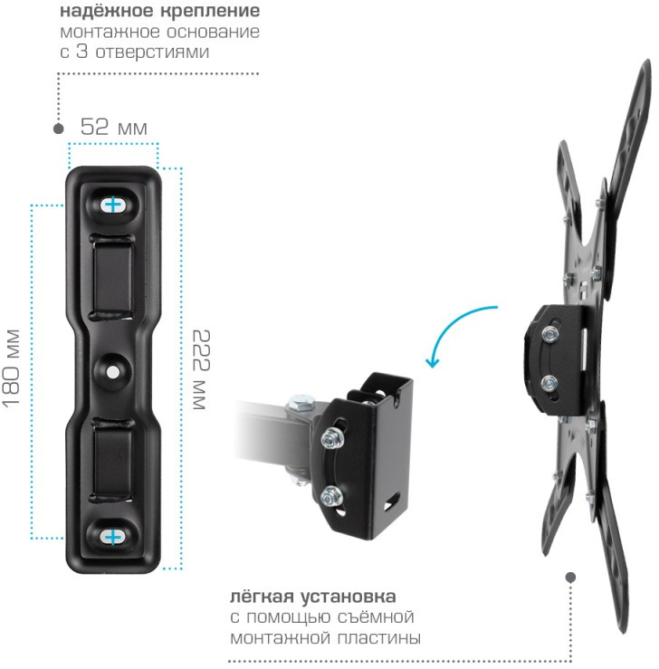 - Легкий монтаж при помощи съемной монтажной пластины