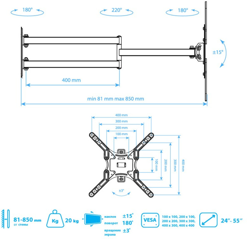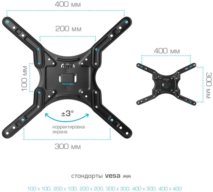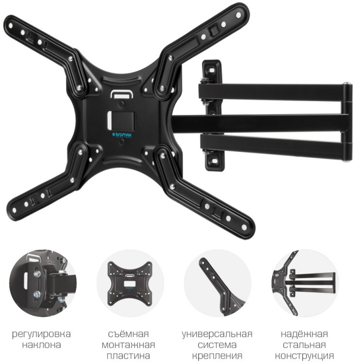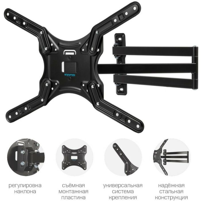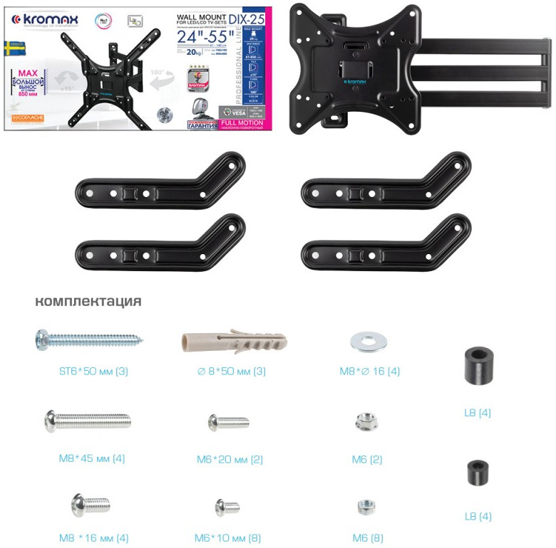 - KROMAX DIX-25 BLACK надёжно удержит экран размером 24"-55" дюйма и весом 20 кг. Простая конструкция KROMAX DIX-25 BLACK идеально подойдет для самостоятельного монтажа. Наклонно-поворотная регулировка позволит наклонять вверх и вниз на ±15°, поворачивать влево и вправо на 180°, и выдвигать на 81-850 мм