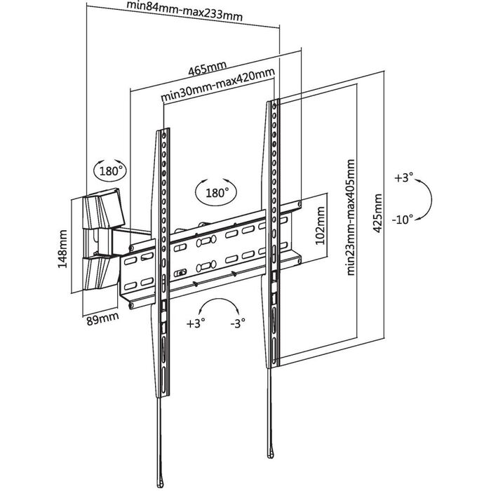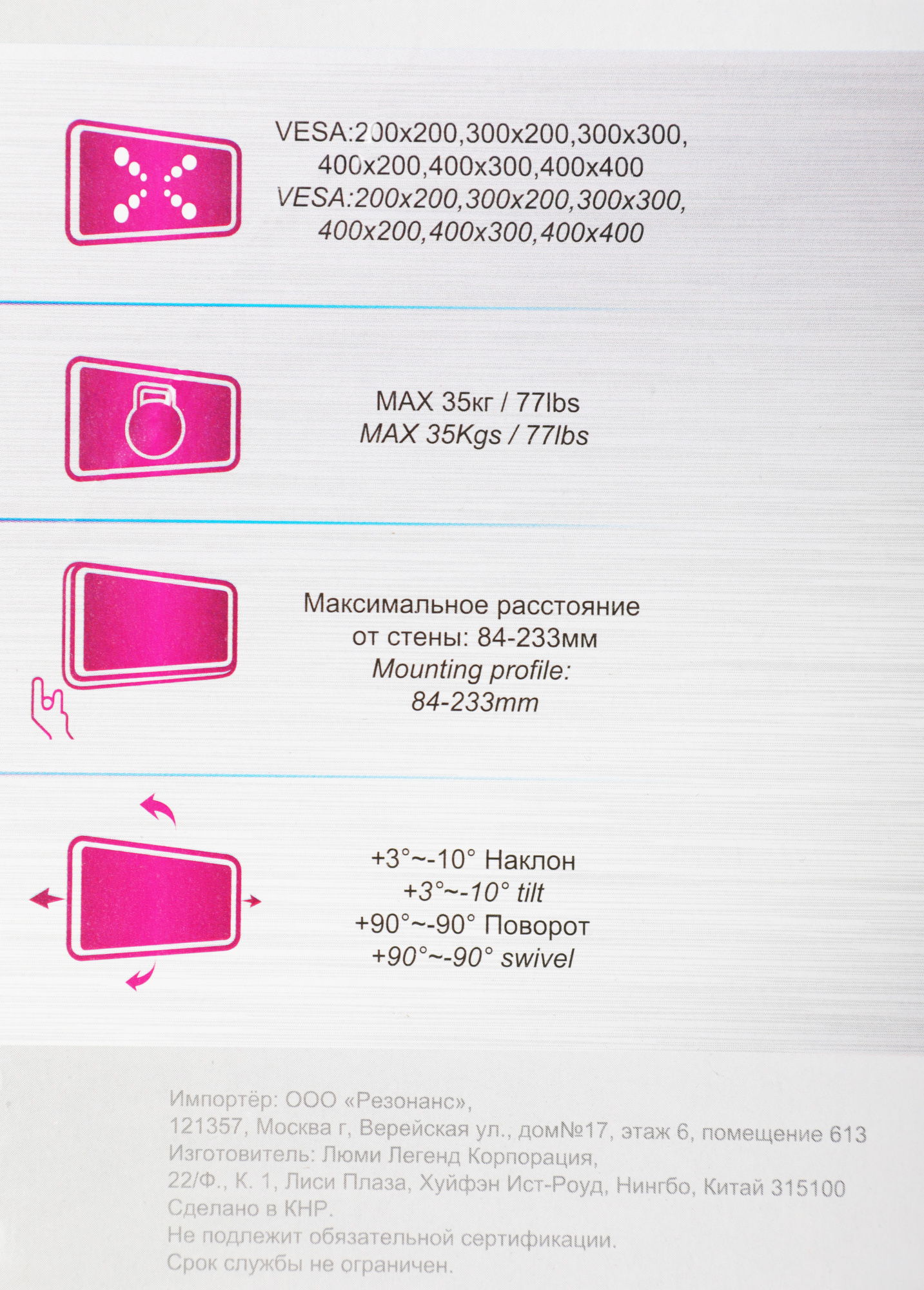 Сверхпрочный рукав кронштейна обладает большой грузоподъемностью. Регулируются углы наклона, подъема и поворота. Выпадающие шнуры обеспечивают легкие монтаж и демонтаж телевизора. Есть возможность отрегулировать положение дисплея по часовой и против часовой стрелки на 3 после завершения монтажа.