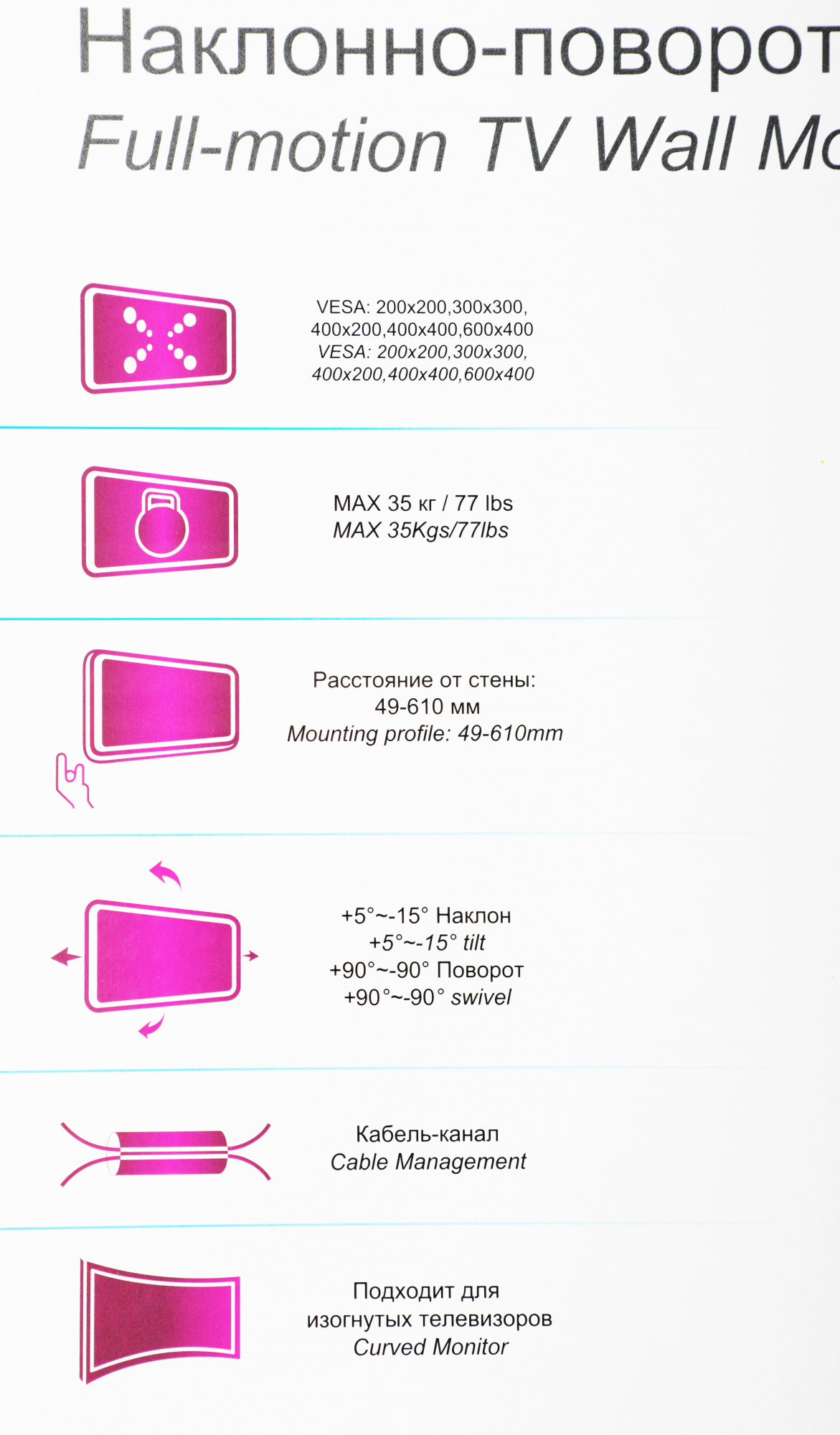 | Подходит для телевизоров c диагональю | 37", 39", 40", 42", 46", 48", 50", 52", 55", 60", 65", 70", 75" |