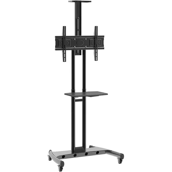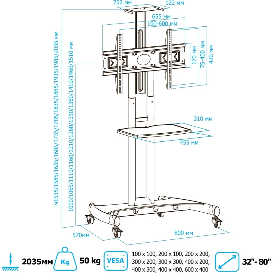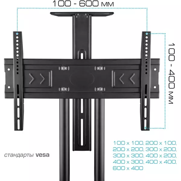 ОсобенностиУниверсальная система крепления для любого телевизора с посадочными отверстиями по горизонтали от 100 мм до 600 мм, по вертикали от 100 мм до 400 мм, Надежная стальная конструкция, Регулируемая высота до 2035 мм, Кабель канал удобная прокладка соединительных кабелей внутри штанги