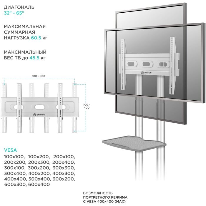 | Поддержка крепления VESA | 100x100, 200x100, 200x200, 200x300, 300x100, 300x200, 300x300, 300x400, 400x200, 400x300, 400x400, 500x400, 600x400 |
