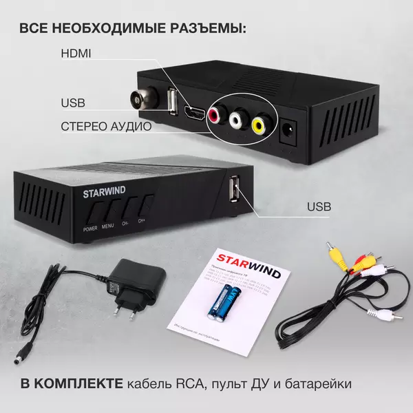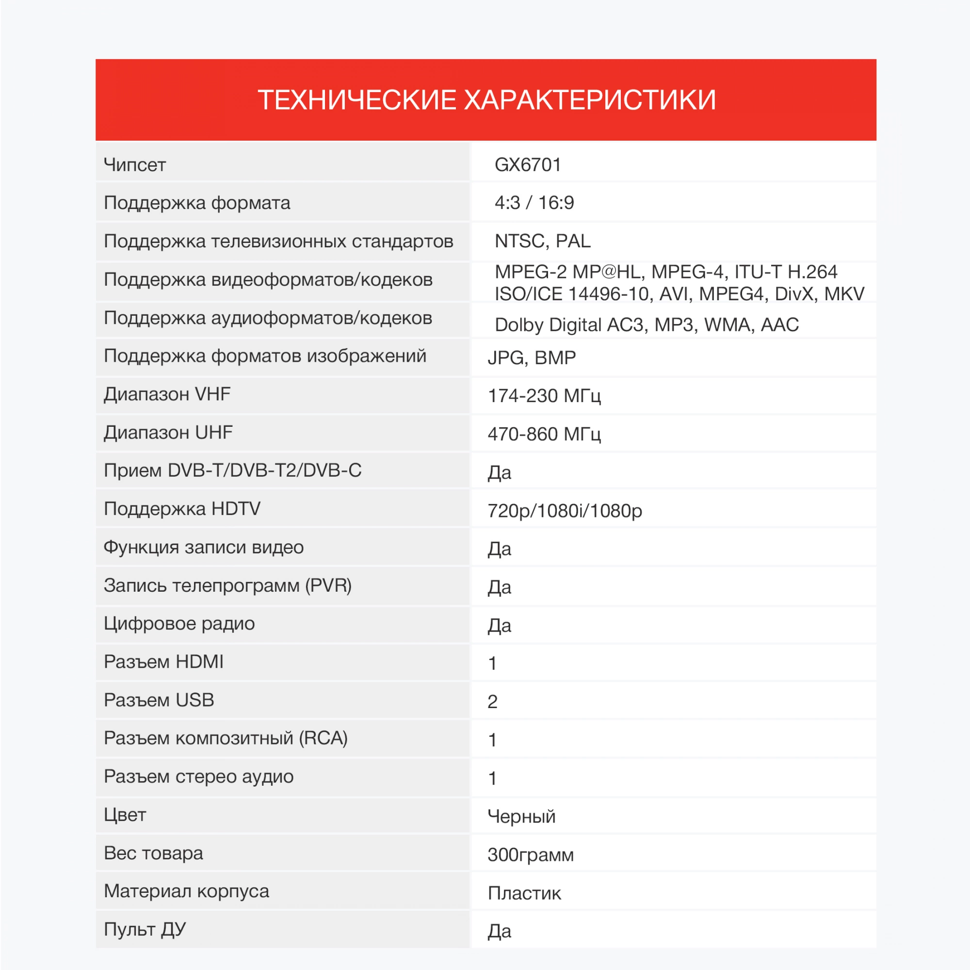 | Особенности | кнопки управления на корпусе, при подключении к интернету (USB WiFi адаптер на чипсете MTK MT7601 приобретается отдельно) доступны YouTube, Погода, RSS новости, IPTV, MEGOGO. В комплекте: ТВ-ресивер, пульт ДУ и батарейки к нему, видеокабель RCA, блок питания, инструкция |