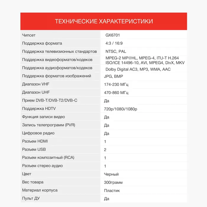 Характеристики Основные характеристики Тип Ресивер DVB-T2 Чипсет GX6701 Поддержка формата 4:3 Да Поддержка формата 16:9 Да...