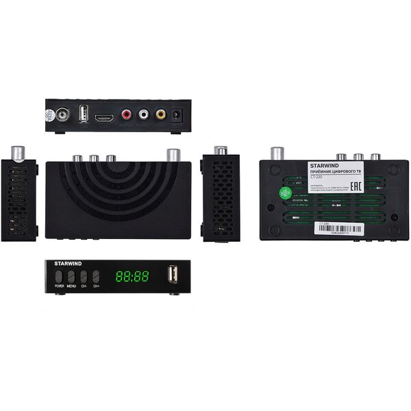| Особенности | кнопки управления на корпусе, дисплей (каналы или часы). При подключении к интернету (USB WiFi адаптер на чипсете MTK MT7601 приобретается отдельно) доступны YouTube, Погода, RSS новости, IPTV, MEGOGO. В комплекте: ТВ-ресивер, пульт ДУ и батарейки к нему, видеокабель RCA, блок питания, инструкция |