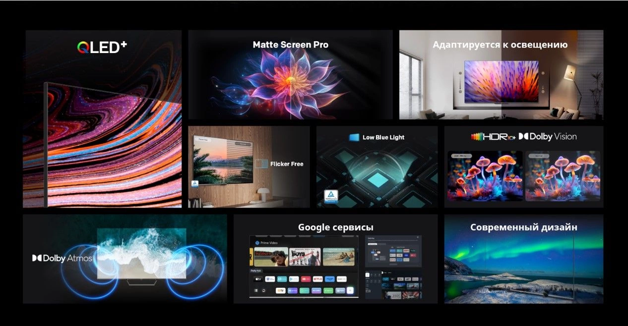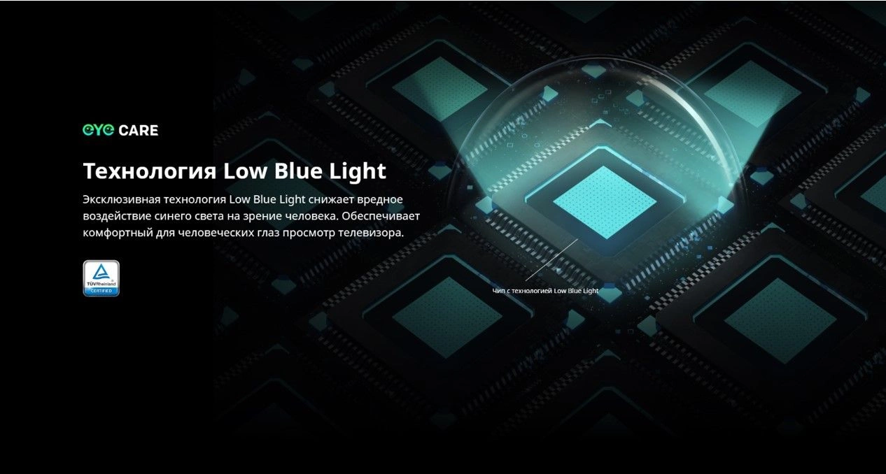 | Особенности | Матовый Экран, Технологии защиты зрения: Low Blue Light (сниженный синий свет), Flicker Free (антимерцание), Ночной Режим, Датчик окружающего освещения, Функция поиска ПДУ, Антибактериальный ПДУ, Режим Кинопроизводителя |