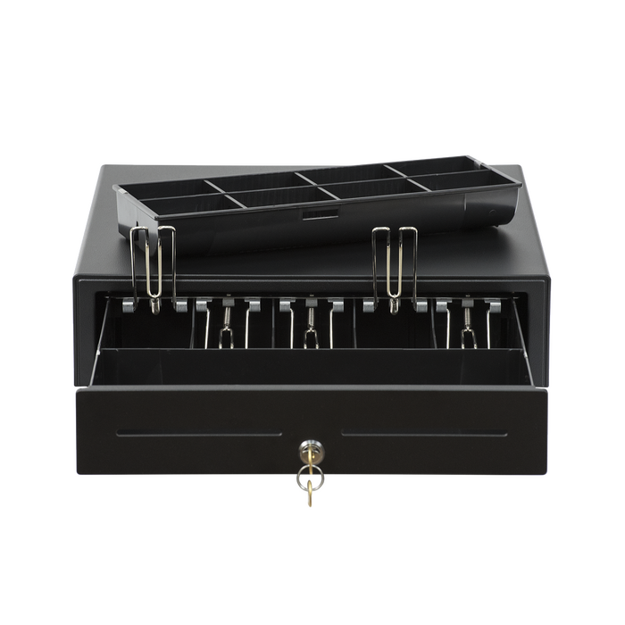 Корпус АТОЛ CD-410 выполнен из металла. В денежном ящике 5 отделений для купюр, 8 ячеек для монет и большое отделение для хранения чеков и счетов. Конструкция денежного ящика позволяет менять ширину отделений для купюр, а отделение для монет может выниматься из денежного ящика. Стальные зажимы для купюр долговечны и надежно фиксируют банкноты.