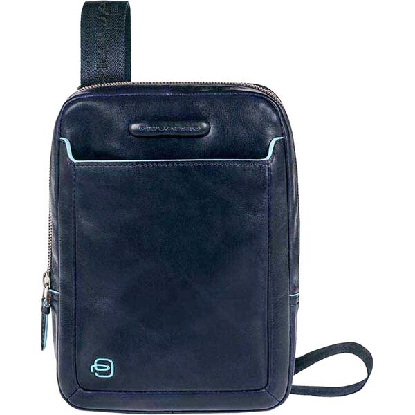 Вертикальная сумка на плечевом ремне Piquadro выполнена из телячьей кожи с легким глянцевым блеском и отделана голубым кантом. Одно основное отделение, отделение для mini Ipad, карман на молнии, съемное крепление для ключей.