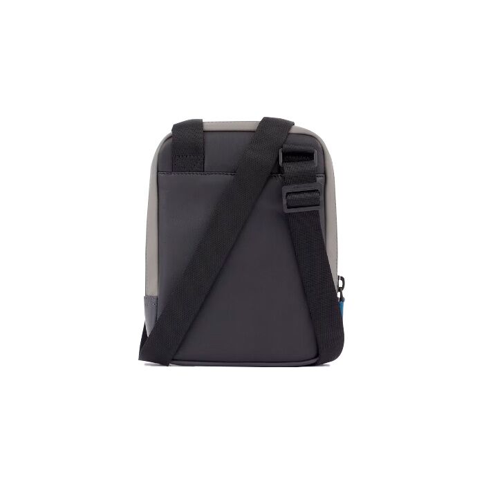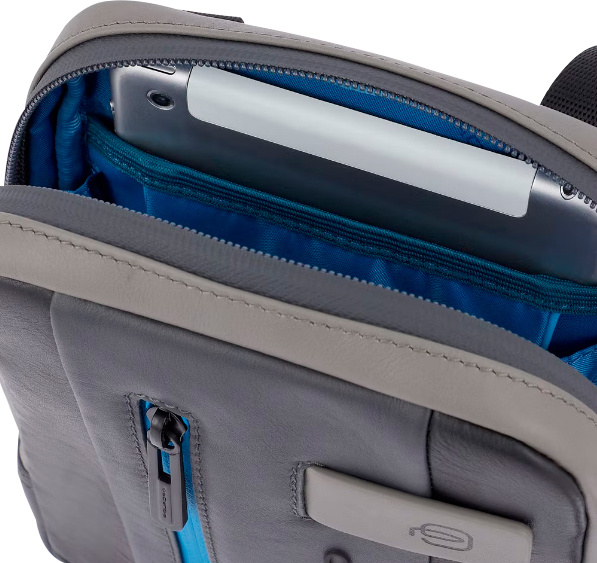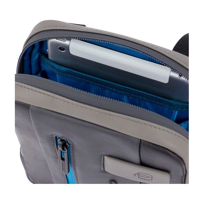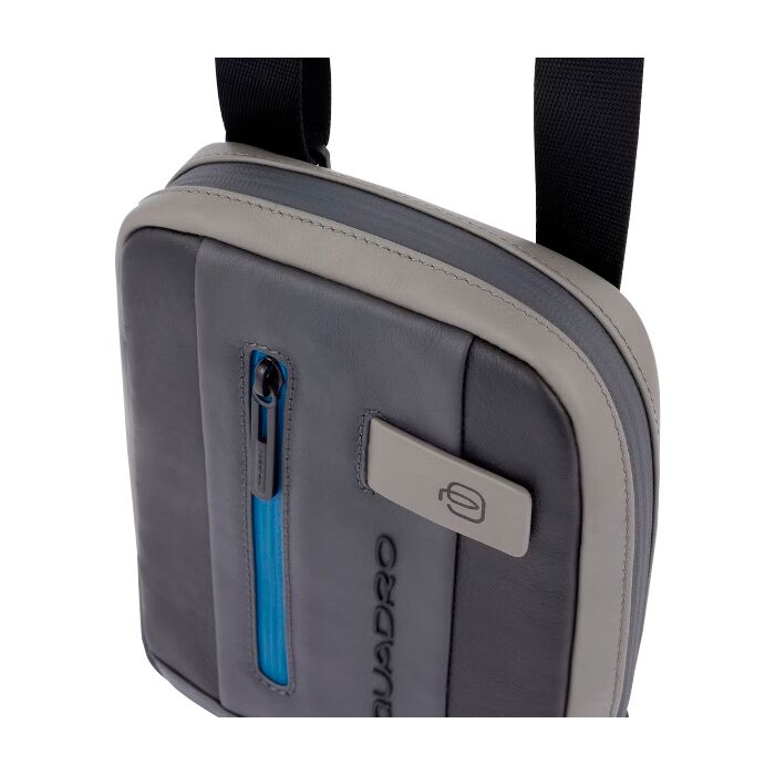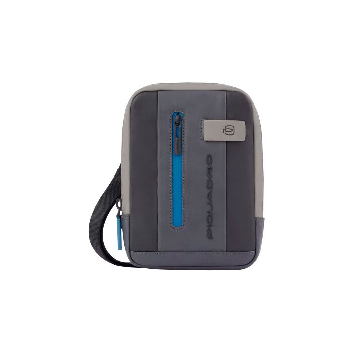 Компактная кожаная сумка через плечо из новой коллекции Piquadro Urban. Сумка изготовлена из гладкой телячьей кожи с использованием черненой матовой фурнитуры. Имеет одно отделение с карманом для iPad mini. На передней части расположен вертикальный карман на молнии и крепление для наушников.