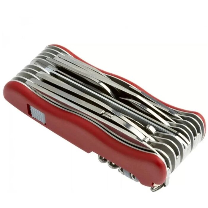 | Список функций | лезвие, большое; 2 открывашки; Отвертка 5 мм; зачистка проводов; пила по дереву и металлу; очиститель копыт; Отвертка 3 мм; стропорез; расширитель, перфоратор; плоскогубцы; кусачки; пинцет; зубочистка; брелок для ключей; мини-отвертка; штопор и др. |