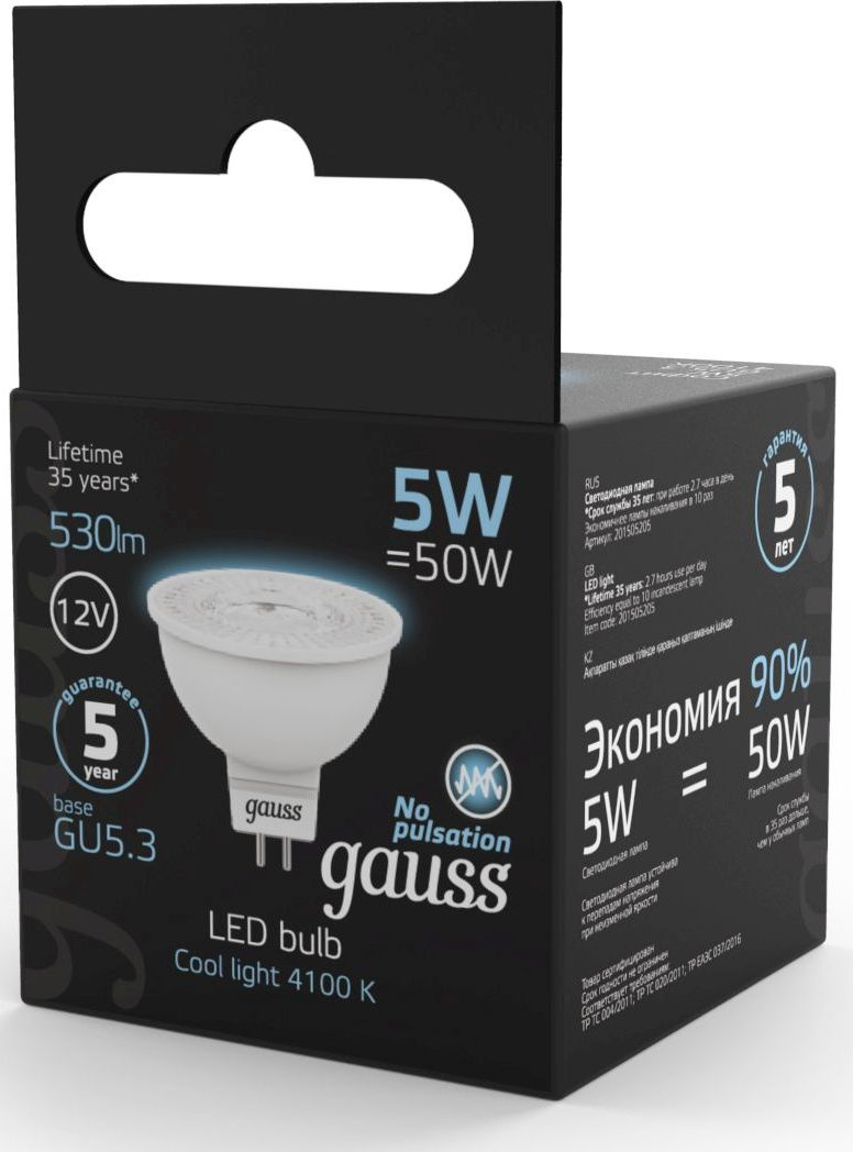 Светодиодная лампа Gauss - безопасный для здоровья и окружающей среды источник света. Она не пульсирует, мгновенно включается, не содержит ртути и имеет больший срок службы, чем лампы накаливания и КЛЛ, экономичнее ламп накаливания до 10 раз.