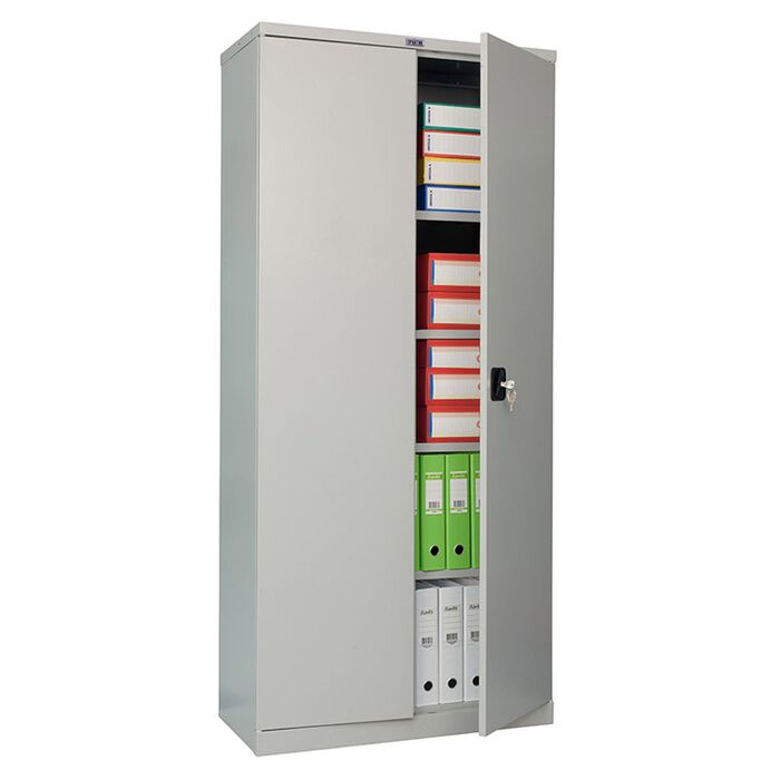 Шкаф предназначен для хранения большого объема документов. Изделия сертифицированы на соответствие требованиям ГОСТ 16371-2014. Ригели из оцинкованной стали и пластиковые втулки обеспечивают бесшумный ход дверей и надежное запирание шкафа. Комплектуются ключевыми замками с ручками. 5 уровней хранения (4 полки в комплекте). Максимальная нагрузка на полку - 60 кг. Шаг установки полок - 25мм. Поставляются в разобранном виде.