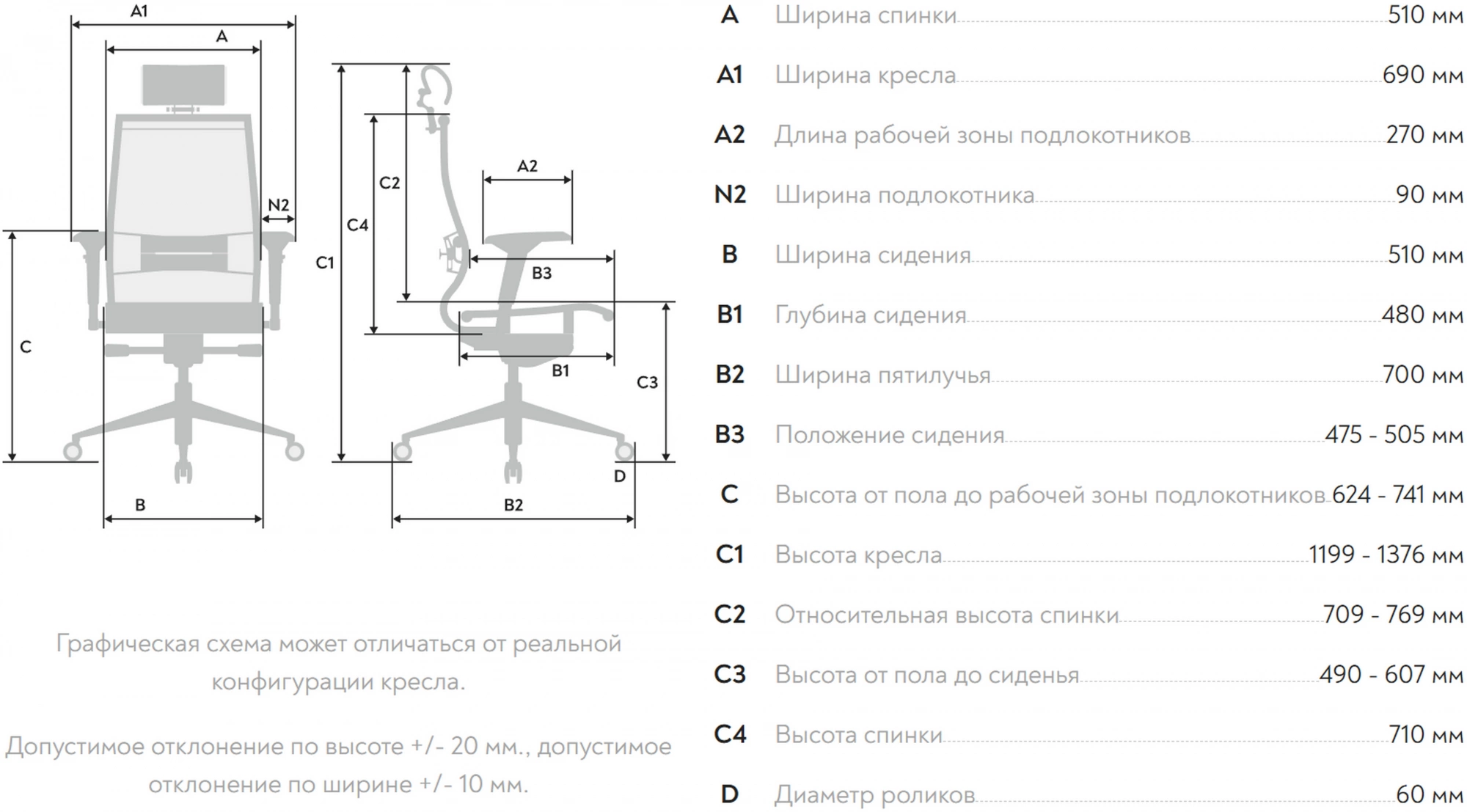 | Глубина сиденья MIN | 480 мм |