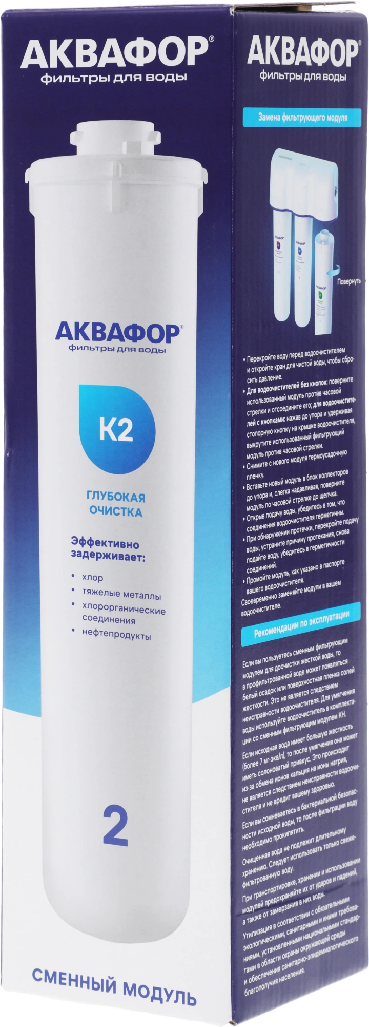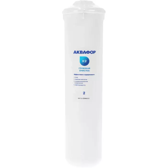 | Особенности | Второй модуль К1-02 рассчитан на глубокую сорбционную доочистку питьевой воды. Благодаря оптимальному соотношению гранулированных и волокнистых сорбентов, эффективно удаляет активный хлор, ионы тяжелых металлов и органические вещества. |