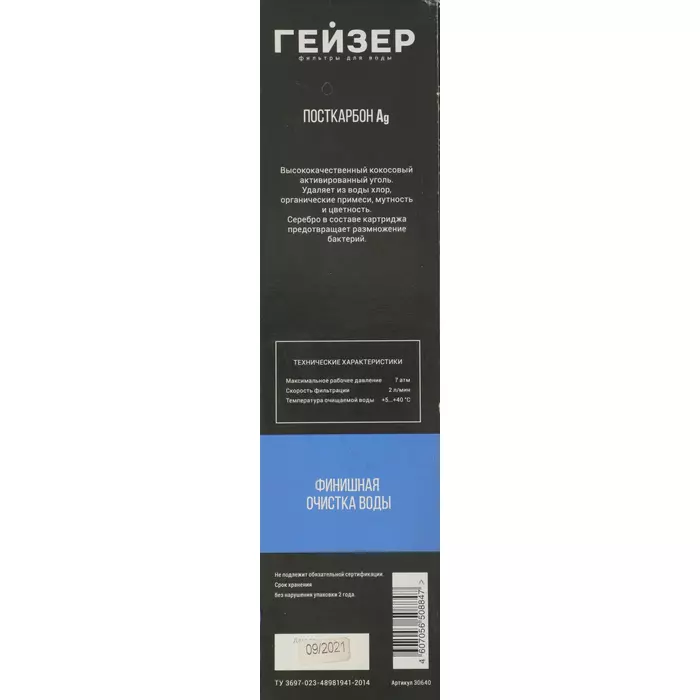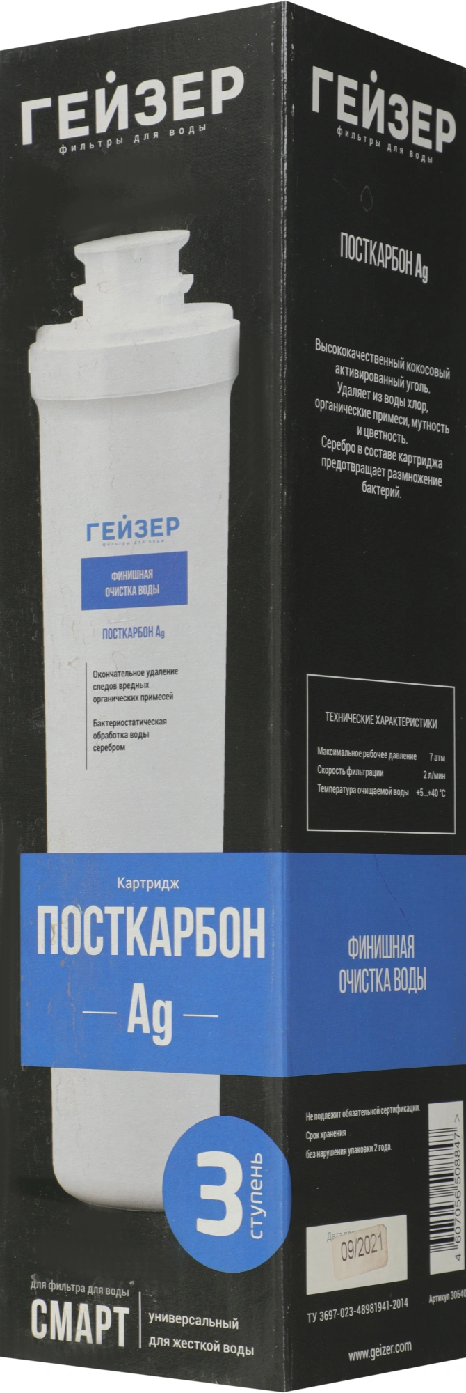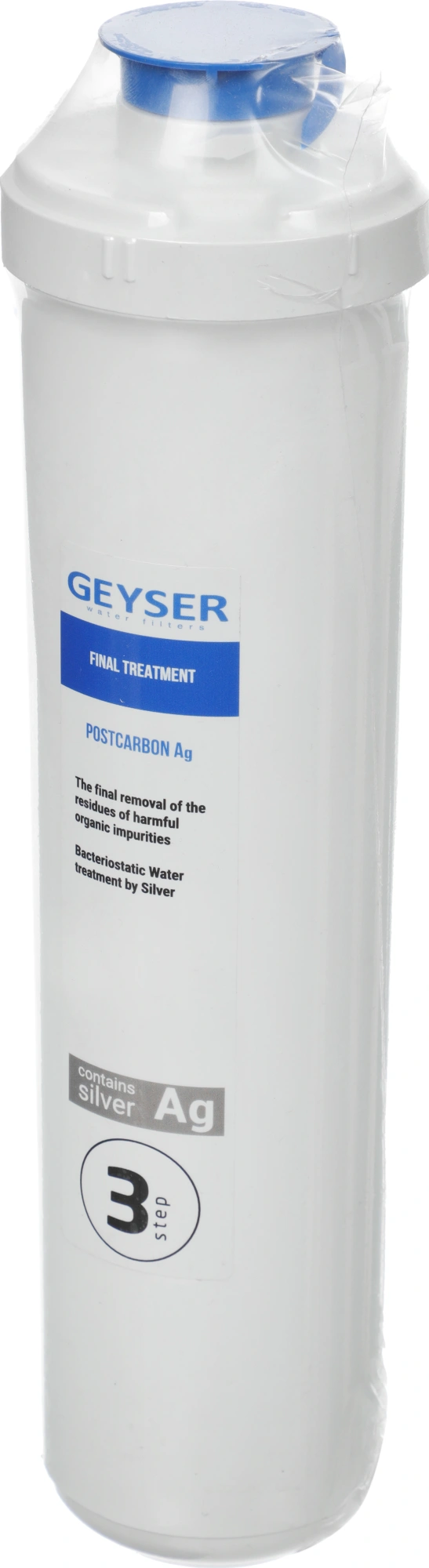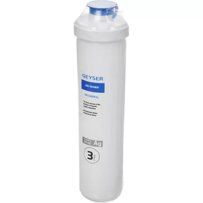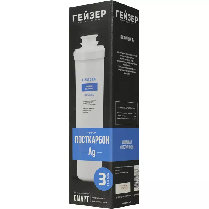 Посткарбон Ag Смарт - это картридж, применяемый для финишной очистки воды от возможных следов вредных органических примесей. Добавление серебра обеспечивает бактериостатический эффект, препятствуя размножению микроорганизмов. Используется в стационарном фильтре серии Гейзер Смарт.