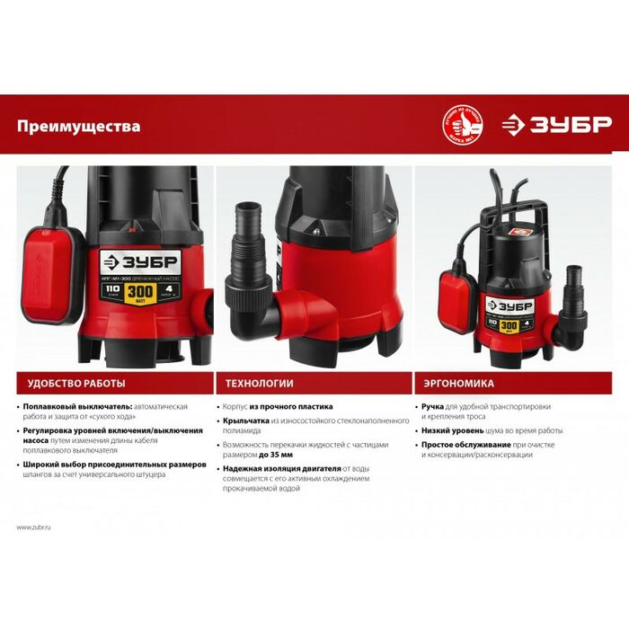 - Автоматическое включение и выключение, термопредохранитель для защиты двигателя, высокие эксплуатационные свойства и простая конструкция обеспечивают надёжное и безопасное применение для перекачивания чистой и загрязнённой воды на садовых участках, при осушении ёмкостей и водоёмов, организации забора воды с глубины (колодцы, скважины) и подачи на высоту, использовании в системах аэрации и дренажа.