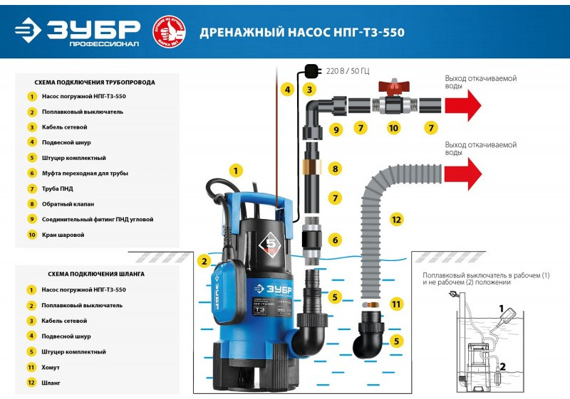 - Поплавковый выключатель обеспечивает автоматическое вкл/выкл при изменении уровня воды