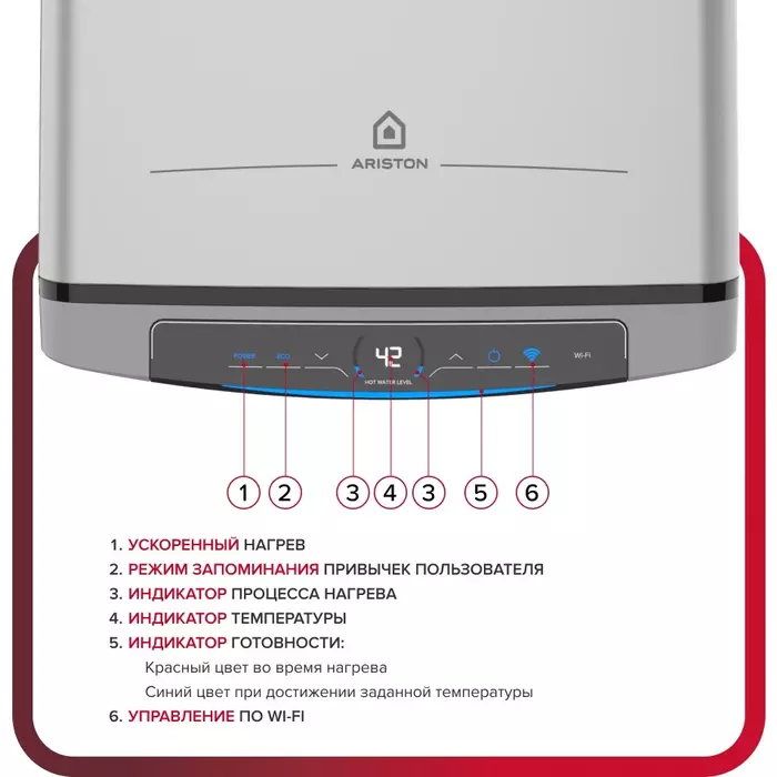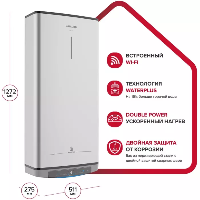 | Особенности | Встроенный Wi-Fi модуль. +15% горячей воды за то же время благодаря технологии WaterPlus. Cистема автодиагностики. Трехступенчатая электронная система защиты. Увеличенный магниевый анод для дополнительной защиты. Профессиональная система защиты от бактерий. |