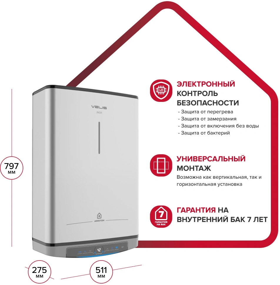 | Защита и безопасность | защита от включения без воды, магниевый анод увеличенного размера, предохранительный клапан, УЗО |