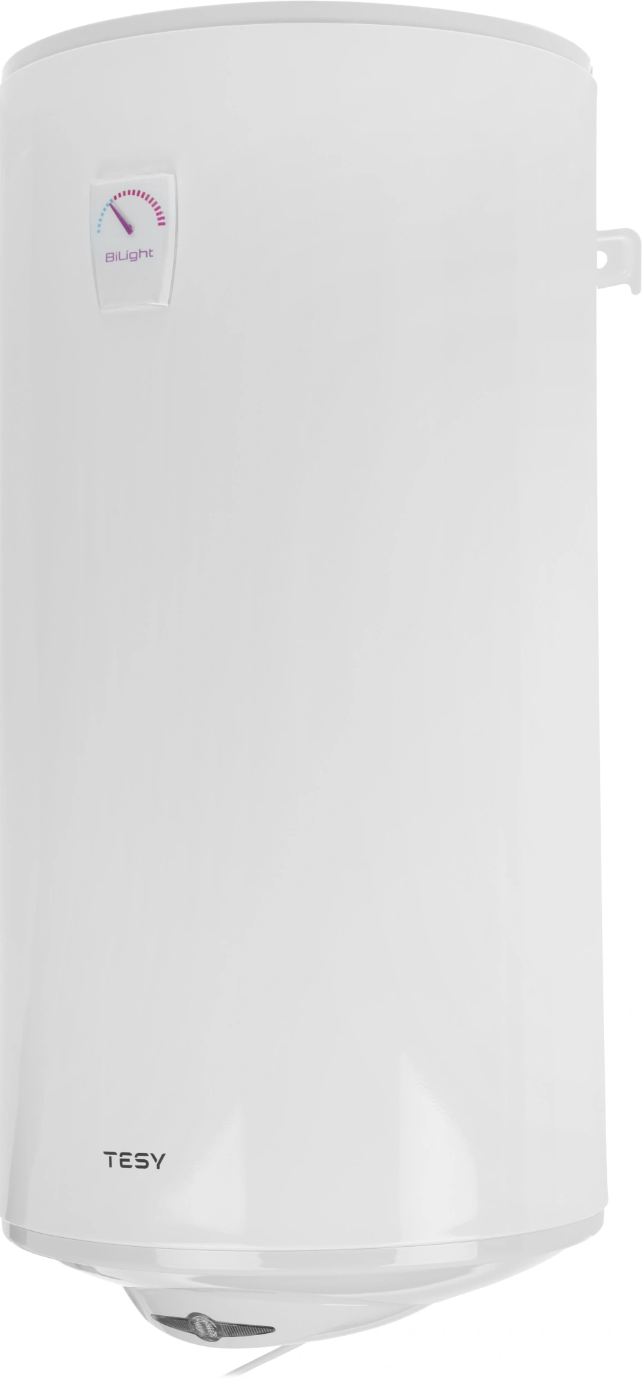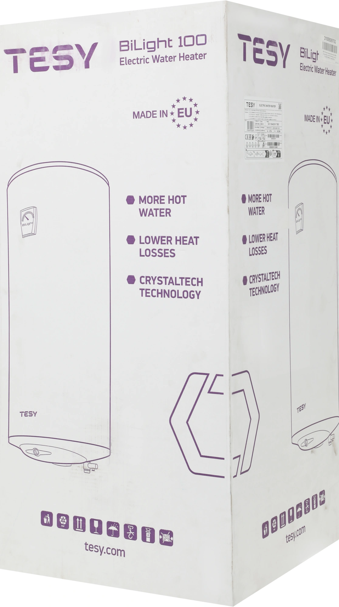 Объем 100 литров, корпус стандартного диаметра 44 см, с механическим управлением, медным ТЭНом мощностью 2,0 кВт и вертикальной установкой, от европейского производителя TESY, c инновационным стеклокерамическим внутренним покрытием бака Crystal Tech.