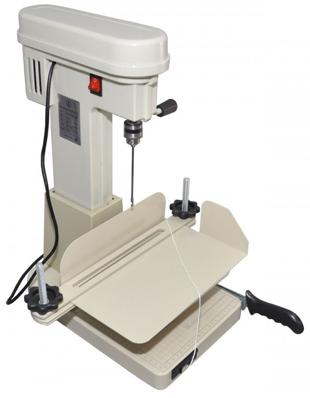 • лоток с переплетаемыми документами специально поднят над рабочим столом, чтобы оператору было удобно продевать нитку в просверленные отверстия обычной иголкой (к примеру);